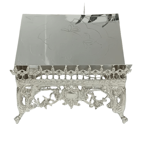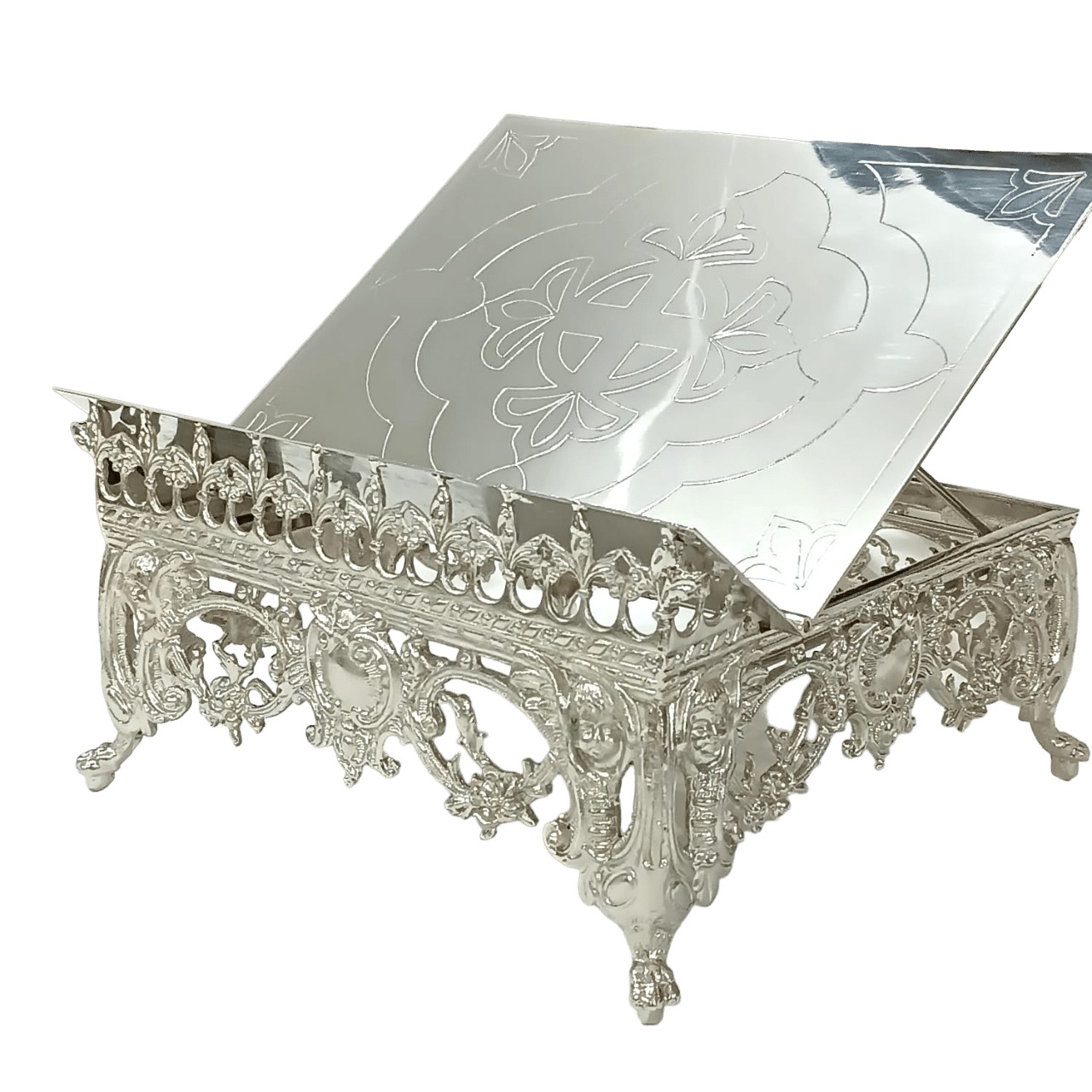 Suporte para missal fabricado em metal com banho a níquel, tendo mais brilho e beleza. Recebe na frente uma gravura em algo relevo, e possui oito opções de altura do suporte do Livro.
