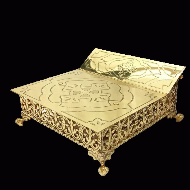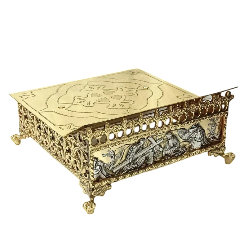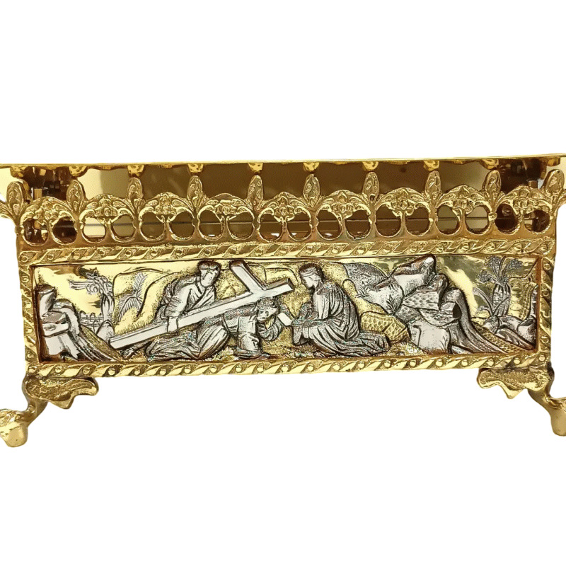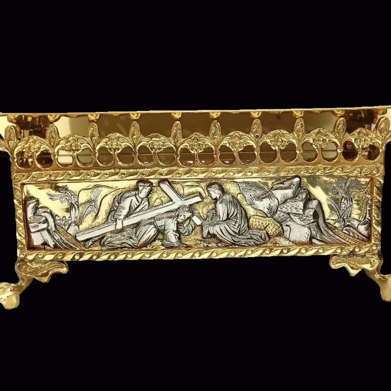 Estante de Altar Metal Via-Sacra 3905. Em latão dourado. Cinzelada a mão. Ilustração da Santa Ceia. Tampa regulável