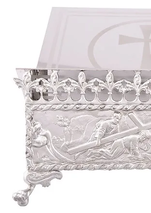 Suporte para missal fabricado em metal com banho de níquel, tendo mais brilho e beleza. Recebe na frente uma gravura em algo relevo, e possui altura regulável com até oito opções de altura do suporte do Livro.