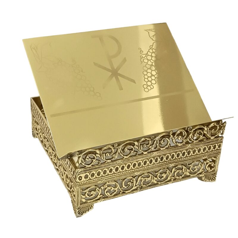 Simbologia Sagrada: O painel frontal com fundo dourado traz em destaque os tradicionais símbolos cristãos: o Alfa (A), o monograma de Cristo (Chi-Rho) no centro, e o Ômega (Ω). Juntos, representam que Cristo é o princípio e o fim de todas as coisas.