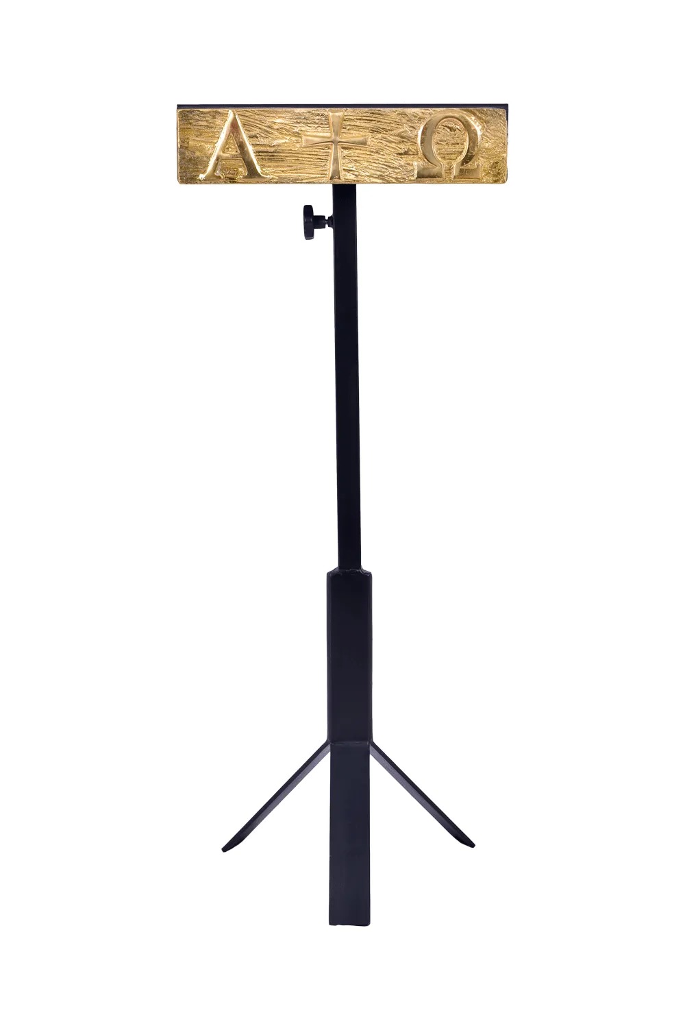 A Estante de Leitura Regulável Alfa e Ômega é uma peça produzida em metal, com aplicação de uma belíssima placa com motivo Alfa e Ômega envernizada e com banho dourado, aplicada na parte frontal. Esta estante é regulável altura mínima 107 cm e máxima 140 cm.
