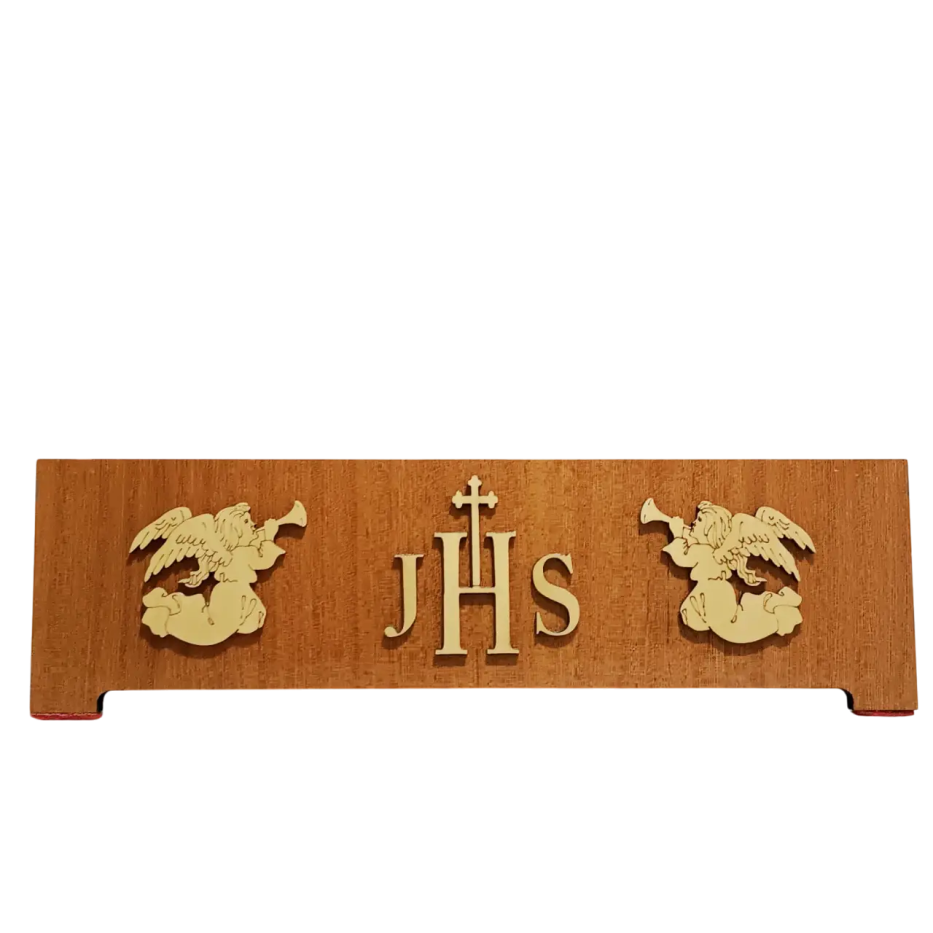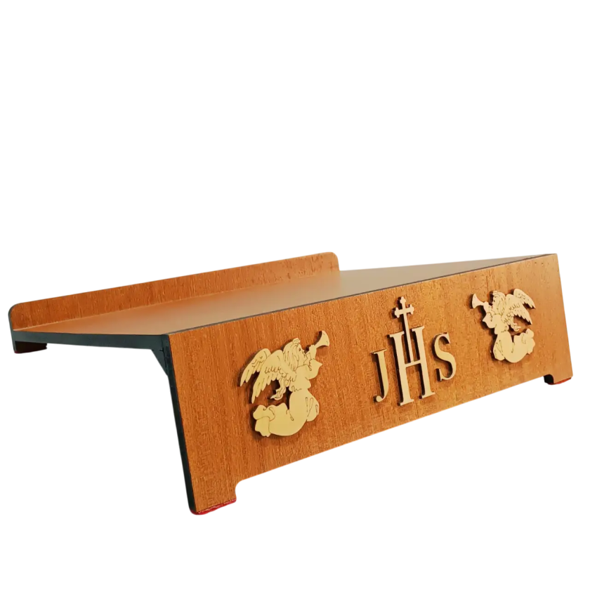 Estante litúrgica produzida em madeira de alta qualidade, ideal para apoiar o novo Missal durante as celebrações. O design é enriquecido com apliques em relevo dourados, trazendo a inscrição JHS ao centro e dois anjos laterais, símbolos de reverência e adoração.
