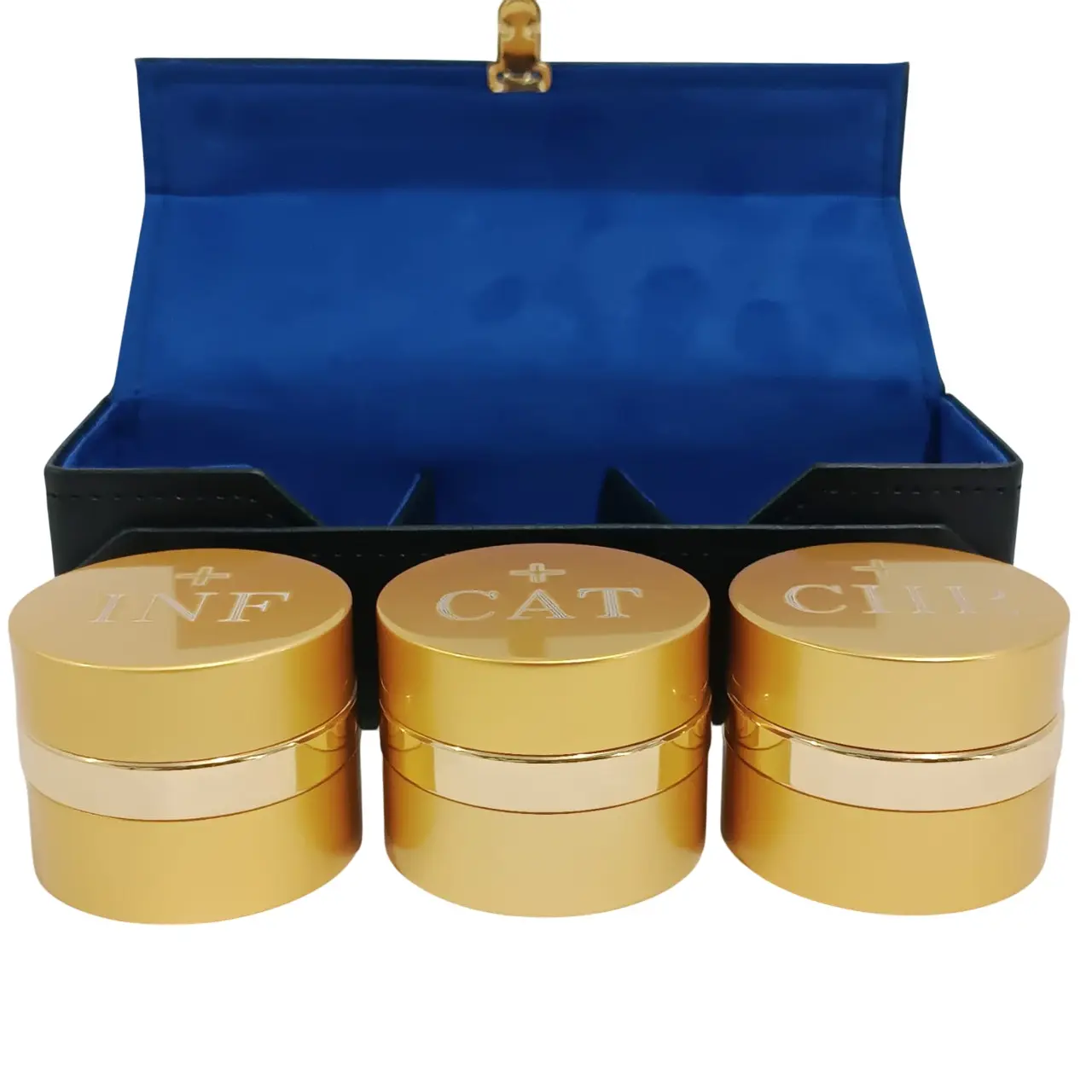 Estojo Santos Óleos com 3 Dourado 7813. 3 Vasos de vidro, com tampa e base de metal com banho dourado. Estojo de couro sintético com fechamento em velcro.