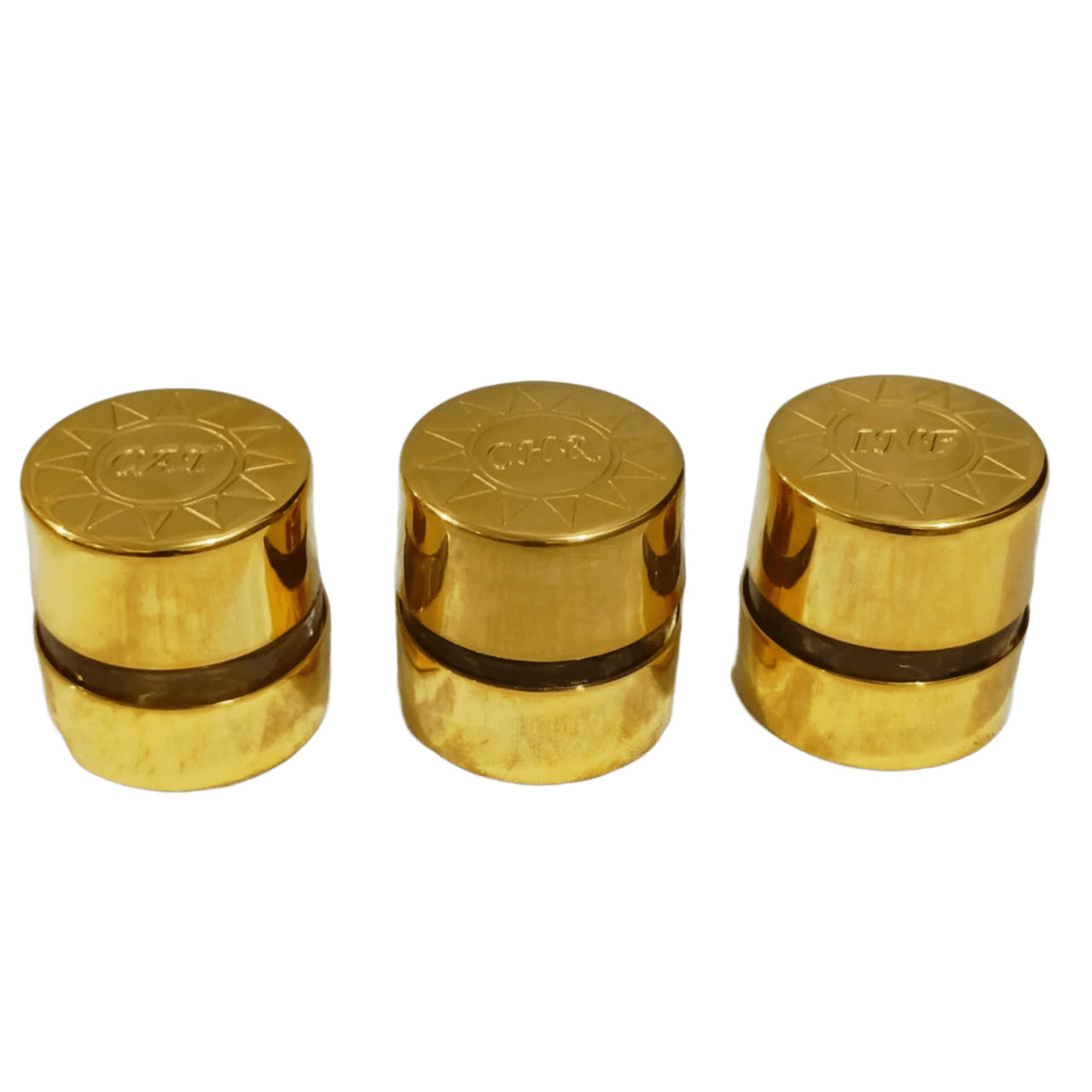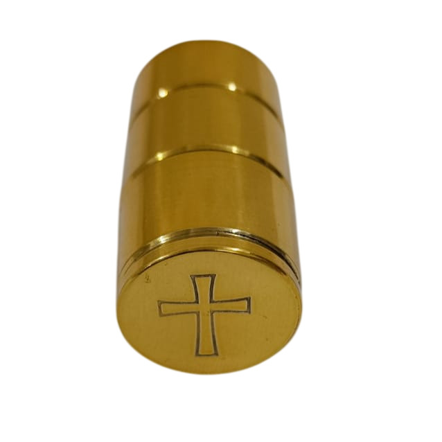 Lindo conjunto formado por um estojo de couro preto forrado de tecido vermelho e três vasos para Santos Óleos com letras INF, CAT e CHR para distinguir os três óleos.