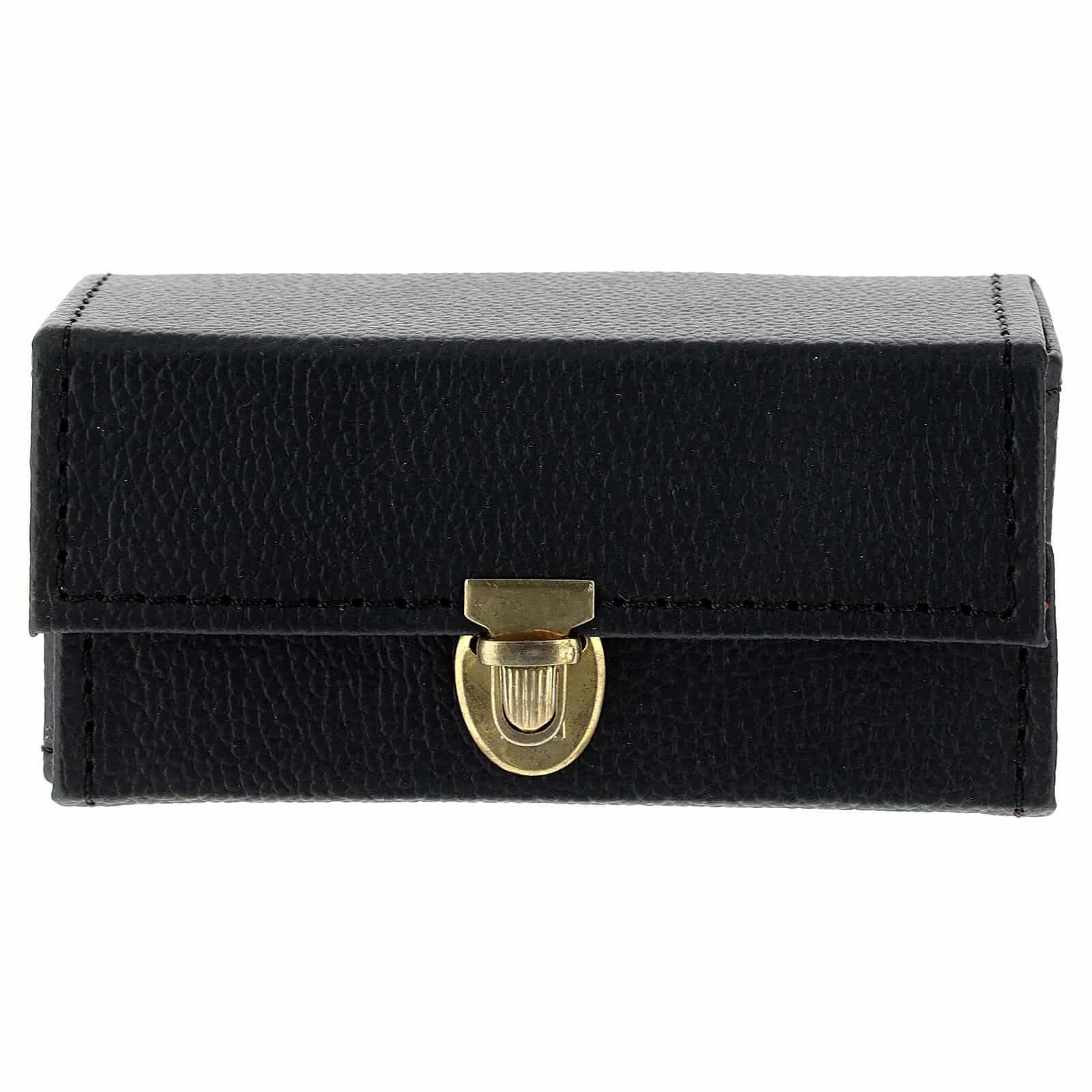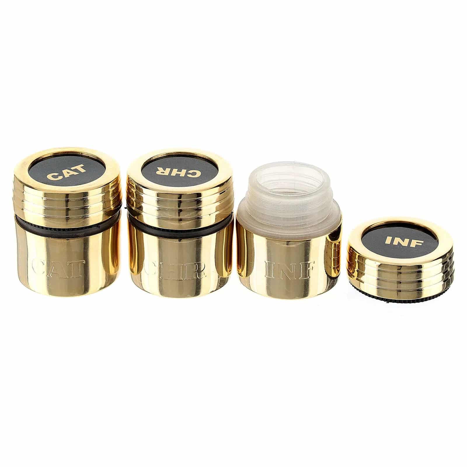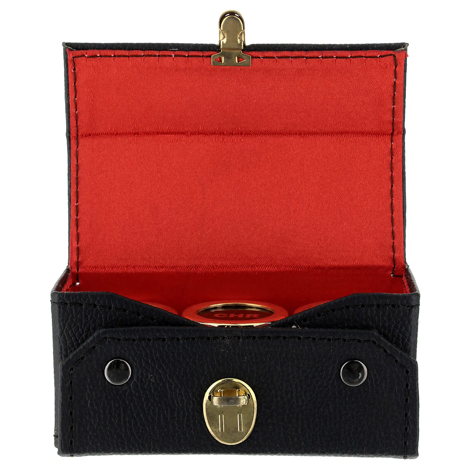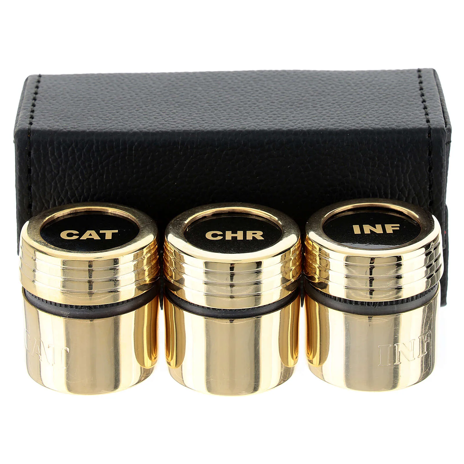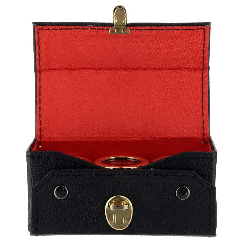 Lindo conjunto formado por um estojo de couro preto forrado de tecido vermelho e três vasos para Santos Óleos com letras INF, CAT e CHR para distinguir os três óleos.
