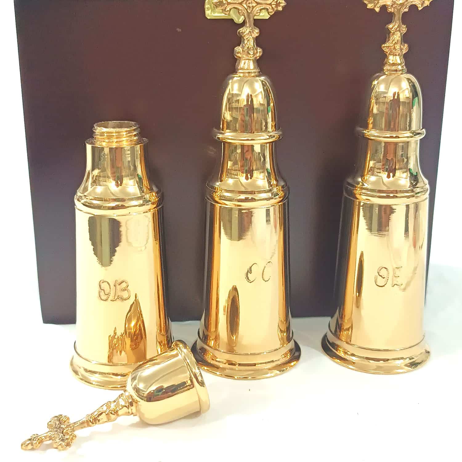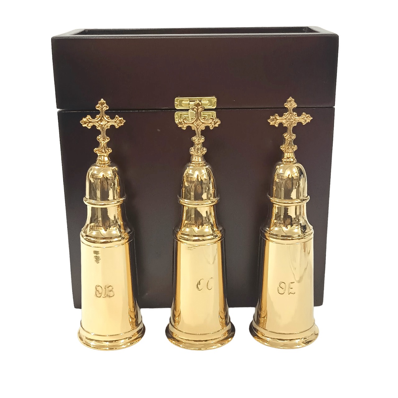Estojo Santos Óleos. 3 Vasos de metal, com tampa, banhados a ouro 24k. Estojo de madeira com fecho na frente