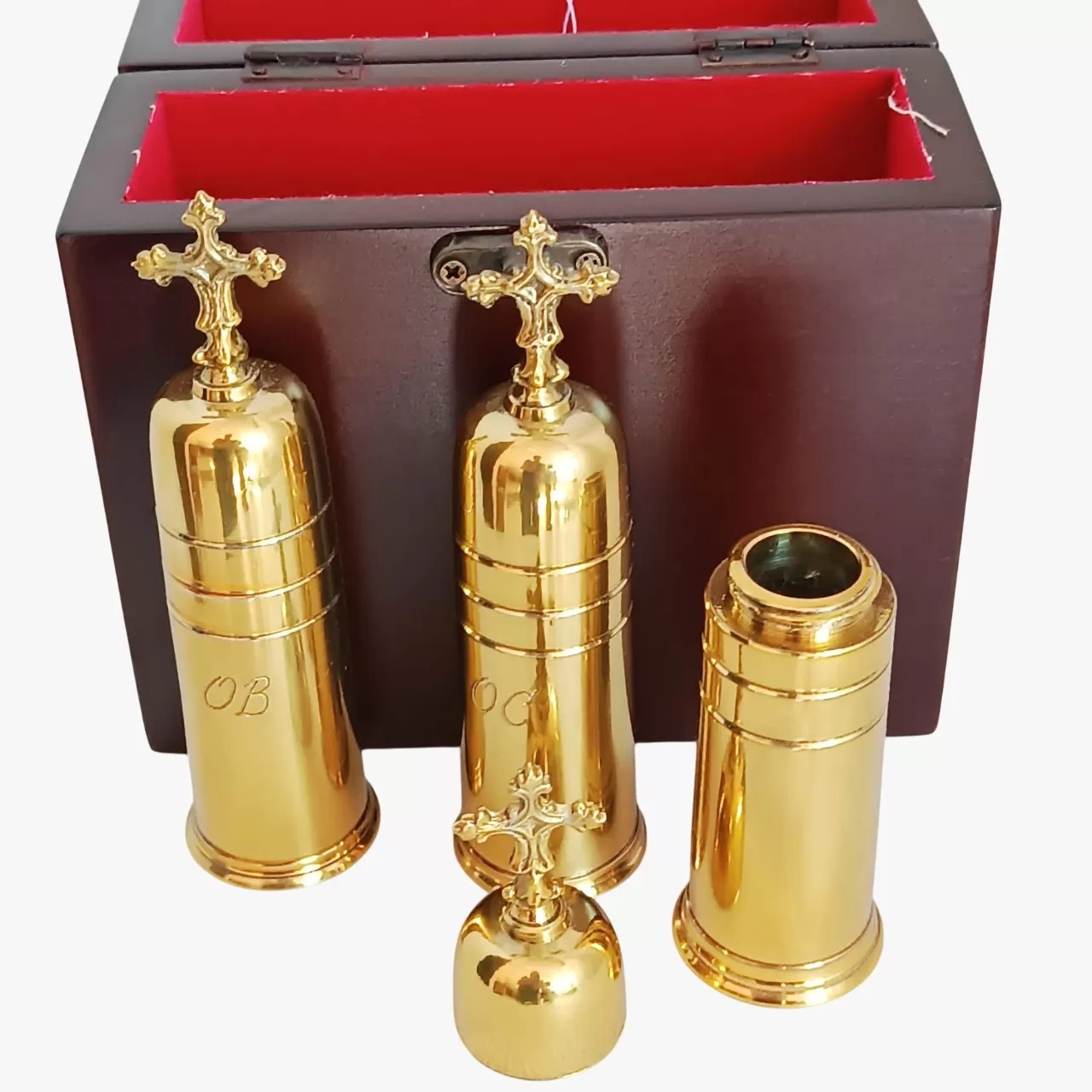 Conjunto litúrgico composto por três vasos para os Santos Óleos — OC (Crisma), OB (Catecúmenos) e OE (Enfermos) — confeccionados em metal com fino banho dourado. Cada recipiente possui uma delicada cruz na tampa e gravação identificadora, garantindo praticidade e reverência no uso. Acompanha elegante estojo em madeira com fecho metálico.