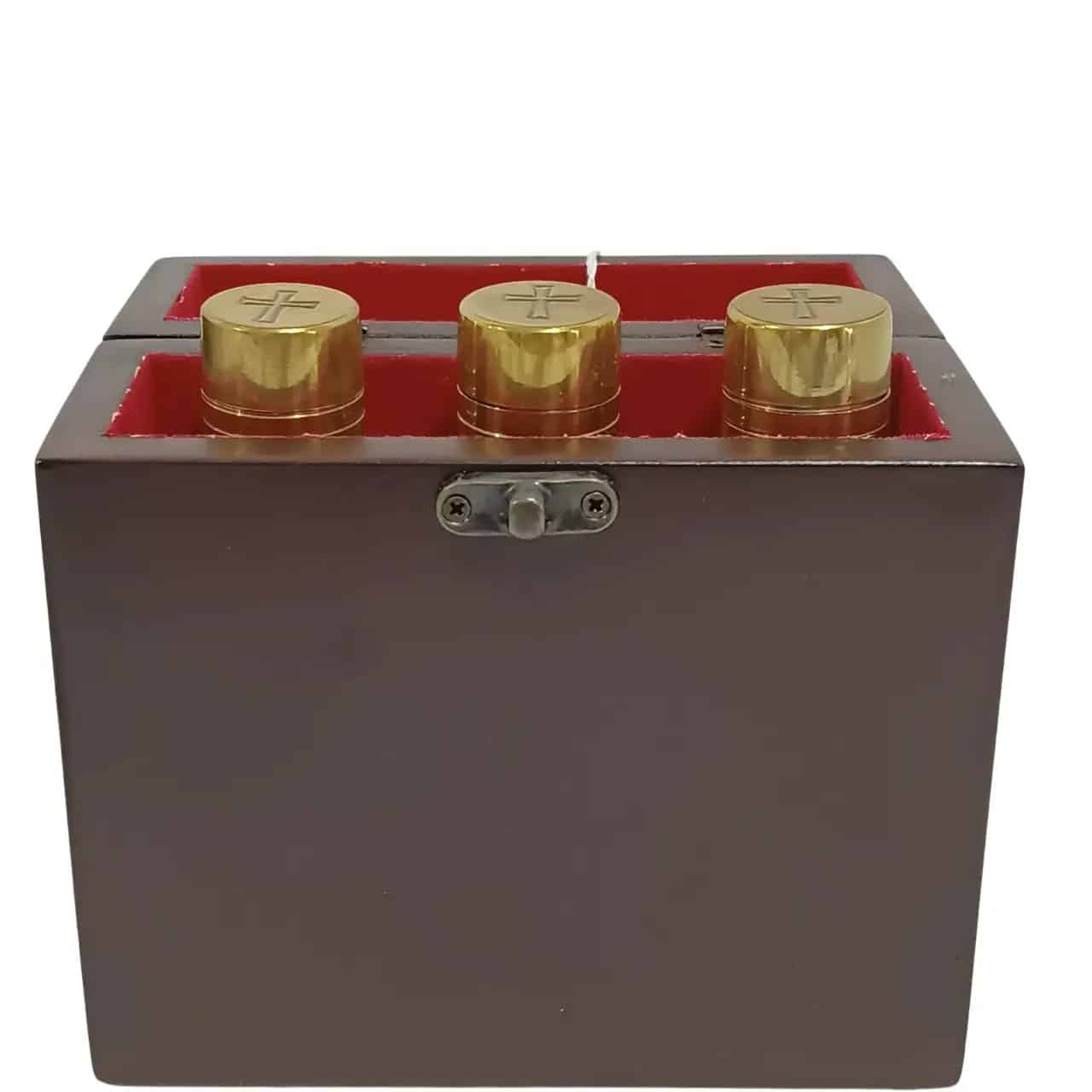 Conjunto litúrgico composto por três vasos para os Santos Óleos — OC (Crisma), OB (Catecúmenos) e OE (Enfermos) — confeccionados em metal com fino banho dourado. Cada recipiente possui uma delicada cruz na tampa e gravação identificadora, garantindo praticidade e reverência no uso. Acompanha elegante estojo em madeira com fecho metálico.