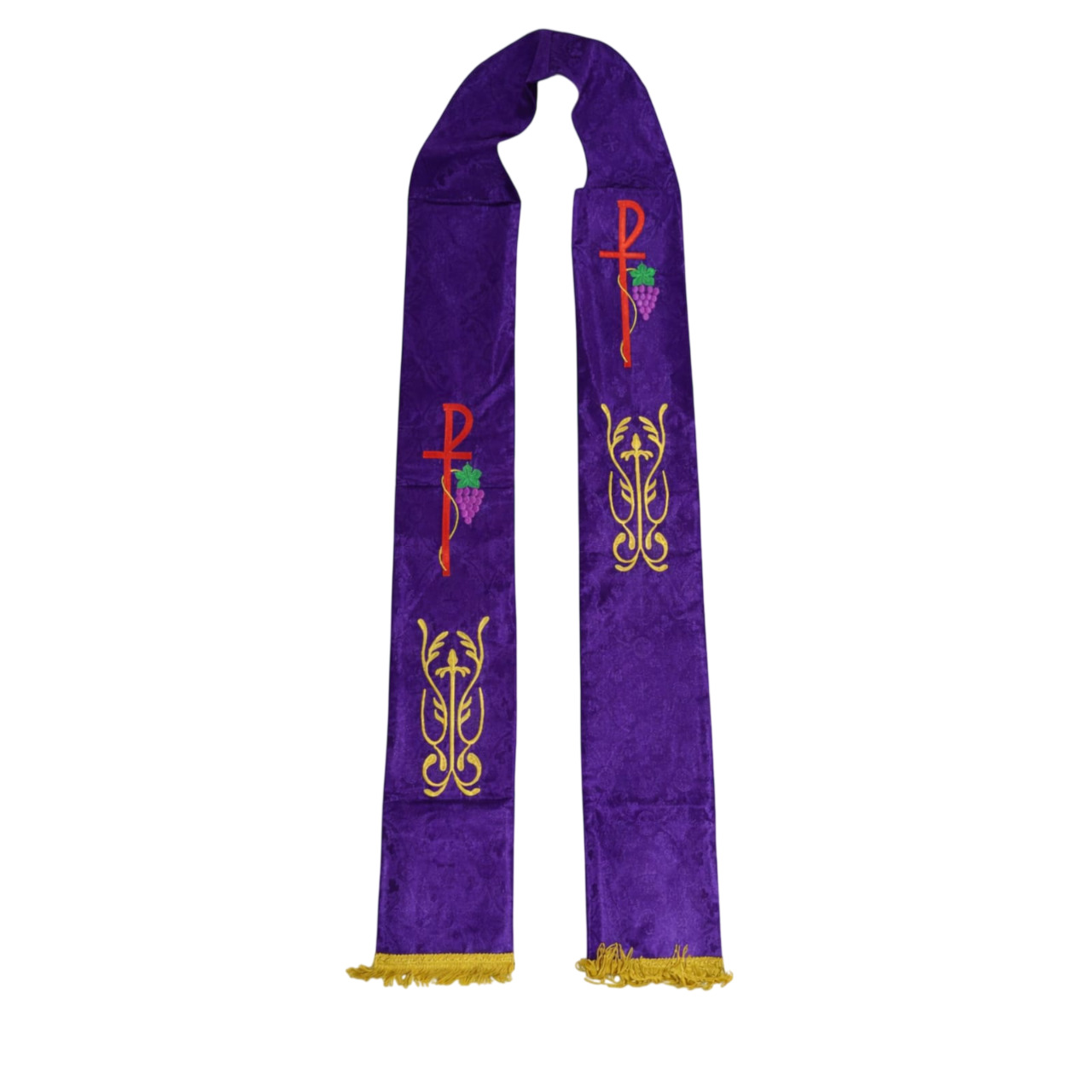 A estola é ricamente ornamentada com bordados simbólicos: o tradicional monograma cristão acompanhado de uvas, remetendo à Eucaristia, e delicados arabescos dourados que reforçam a beleza e a sacralidade da peça. As franjas douradas nas extremidades completam o design com um toque clássico e solene.