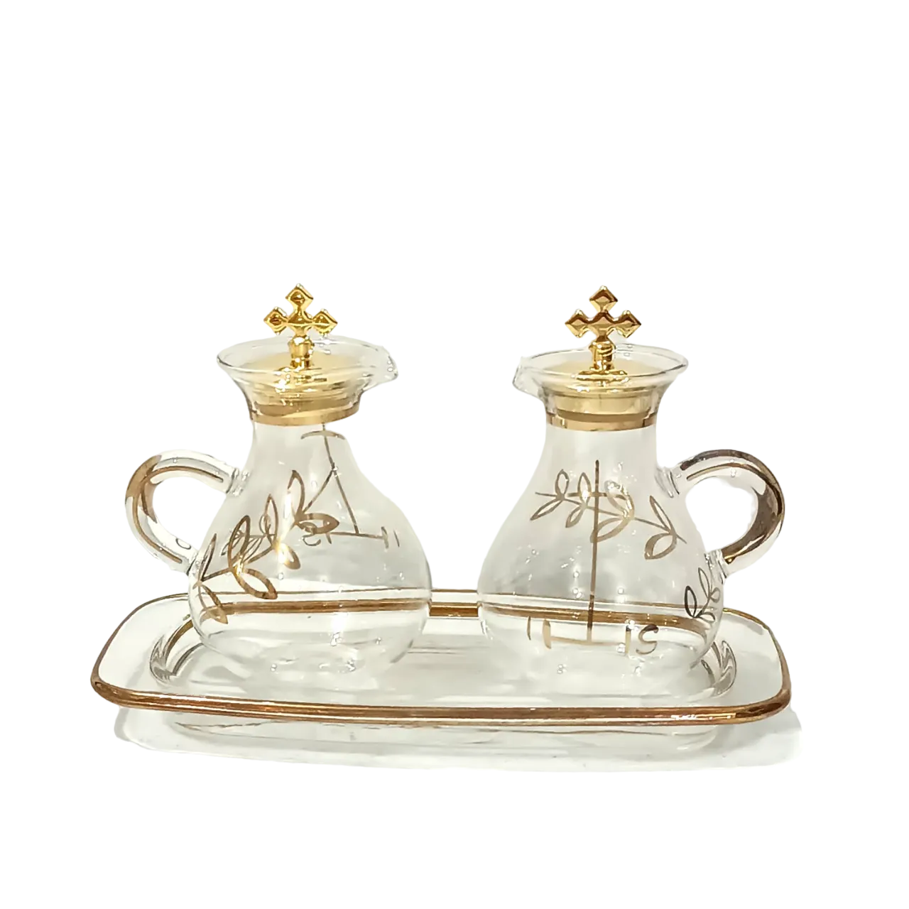 Galheteiro para água e vinho com bandeja de metal. As galhetas são de vidro revestida de metal