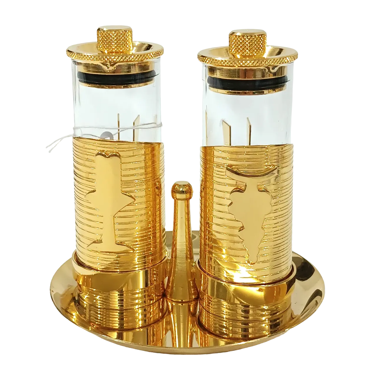 Galhetas de vidros, com bandeja de metal banhada a ouro acompanha. Dimensões Ø 12cm – capacidade100ml