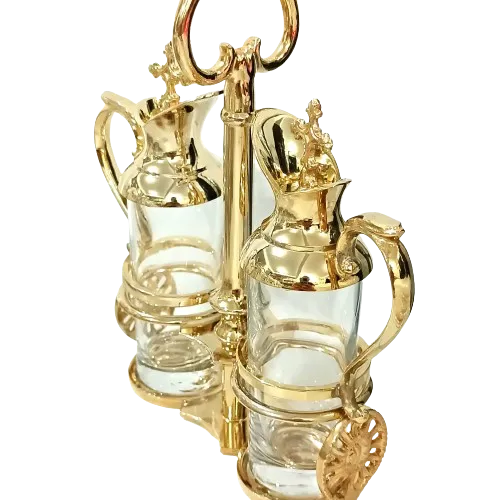 Conjunto Galheteiro composto por 2 galhetas para água e vinho e um suporte em metal banhado.