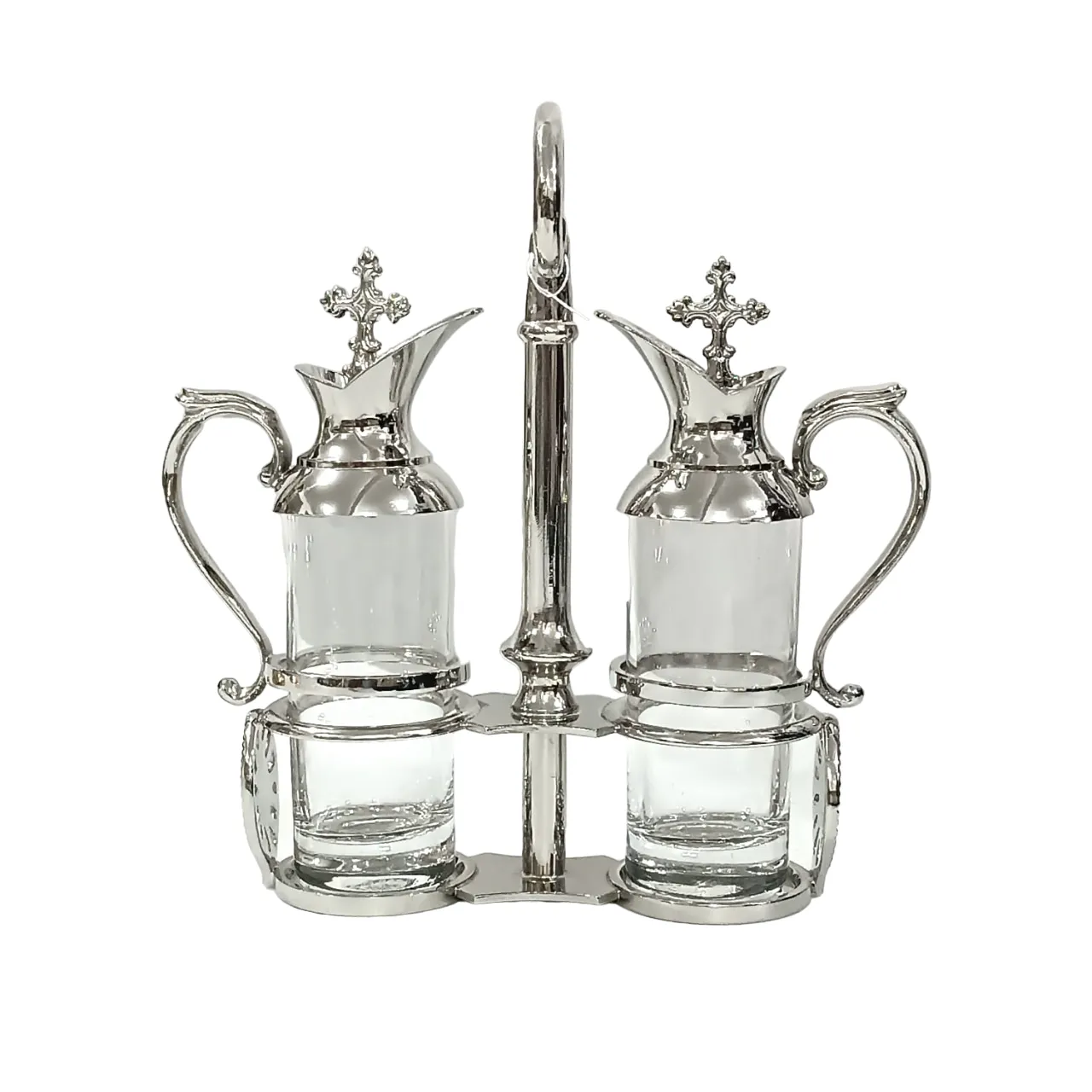 Conjunto Galheteiro composto por 2 galhetas para água e vinho e um suporte em metal banhado.
