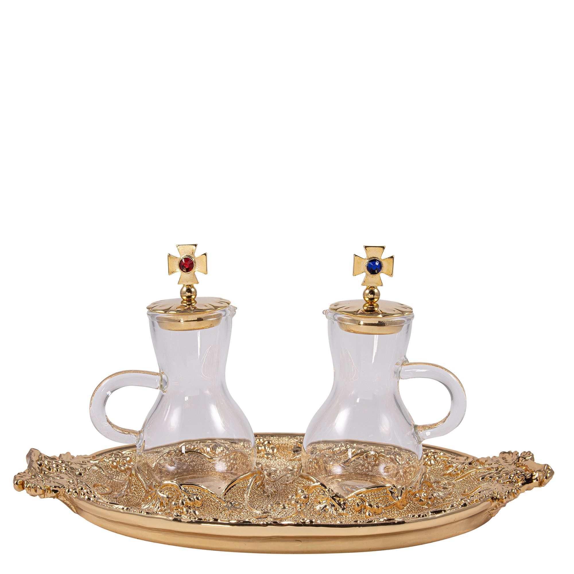 Galheteiro em acabamento dourado, com elegante prato com motivo “Uvas e Folhas de Videira” em relevo.
