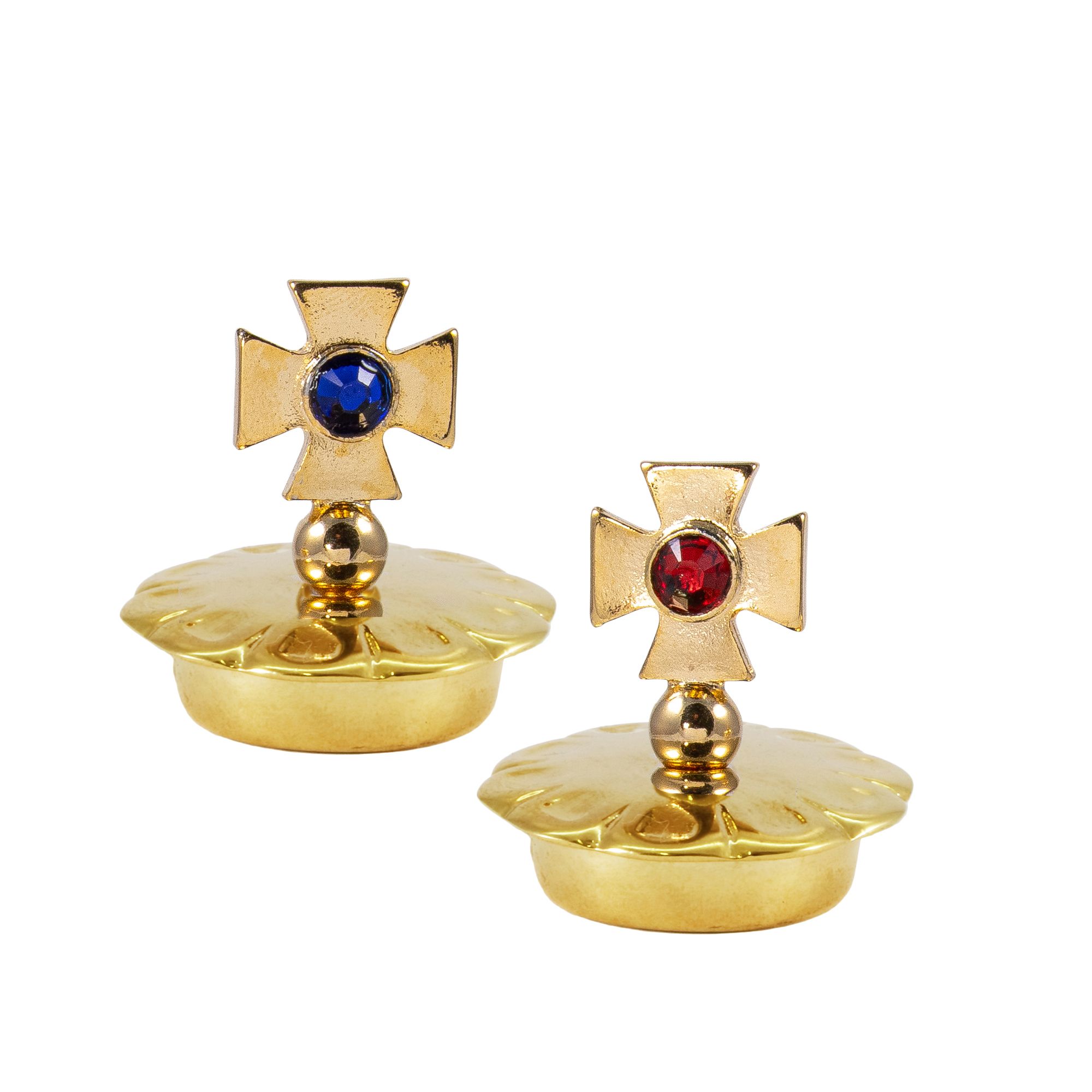 Rolhas douradas com cruz redonda e conjunto de pedras vermelhas e azuis, para distinguir a água do vinho.
