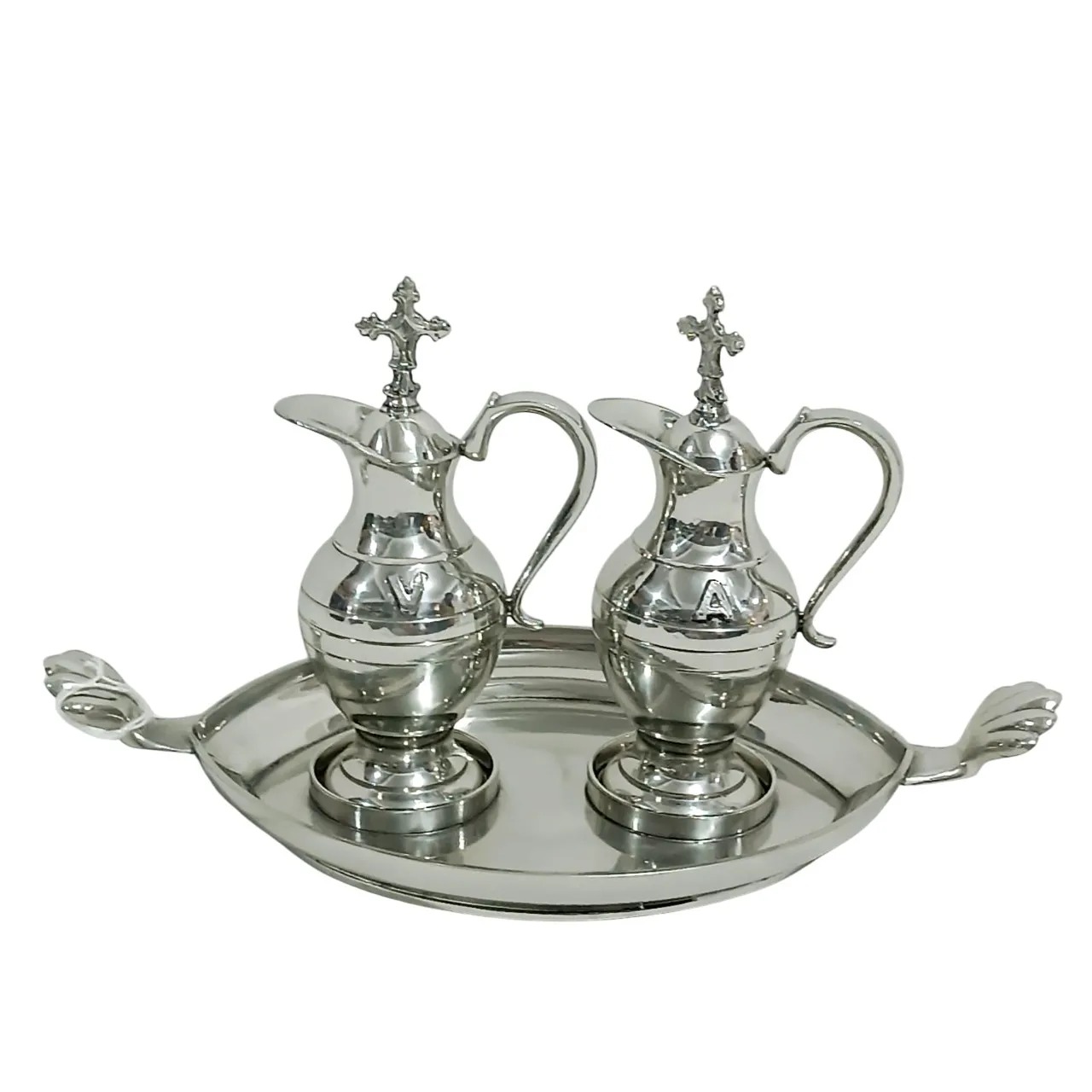 Galheteiro F201/301A. Bandeja e jarrinhas em estanho polido, com verniz especial incolor. Garantia de 5 anos.