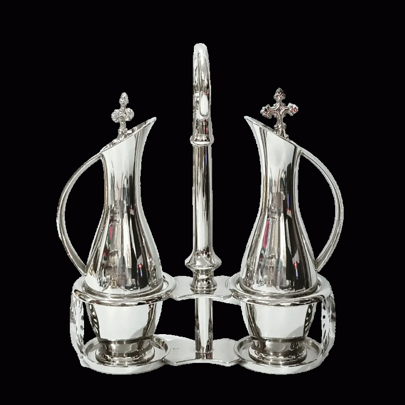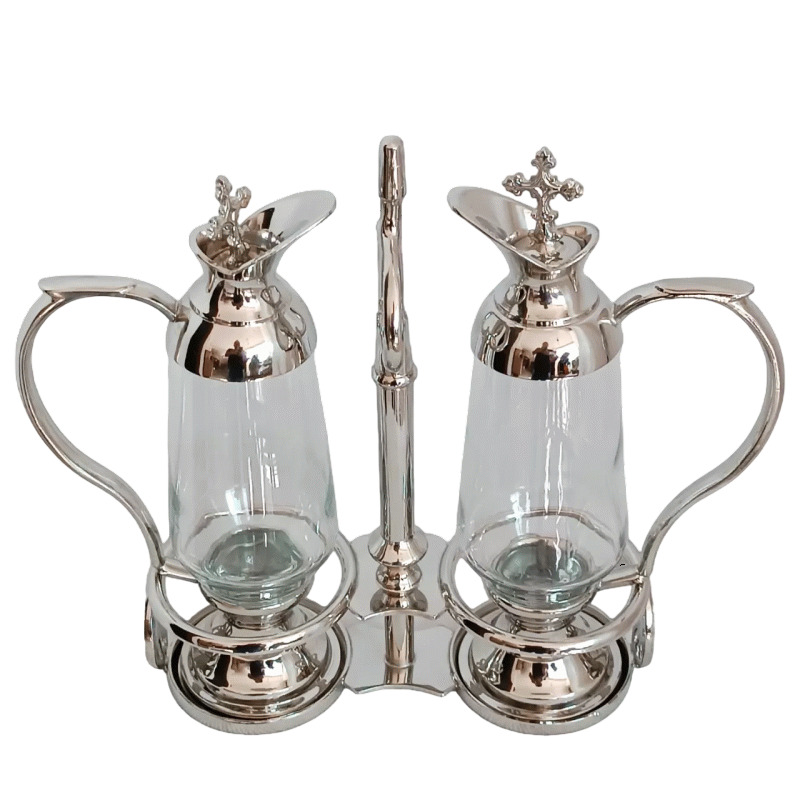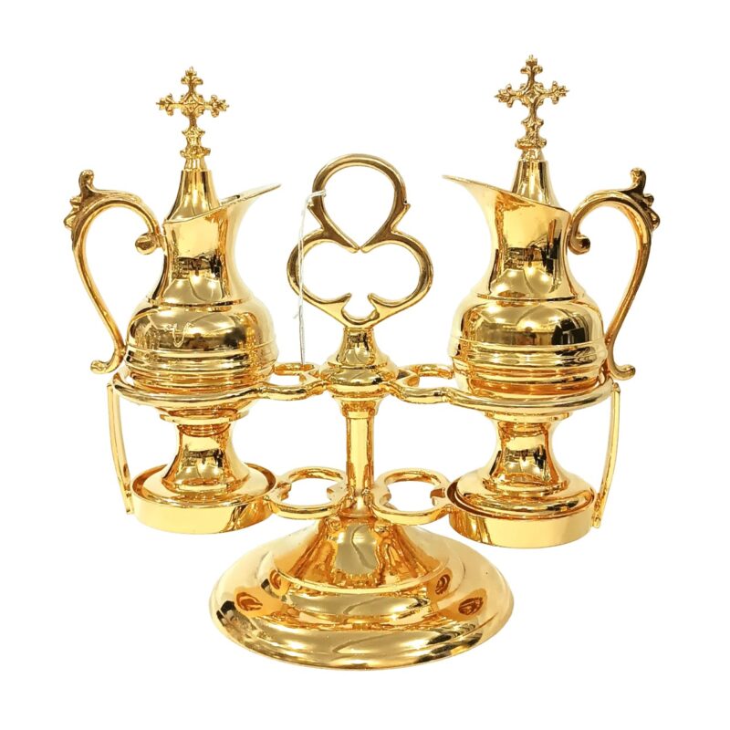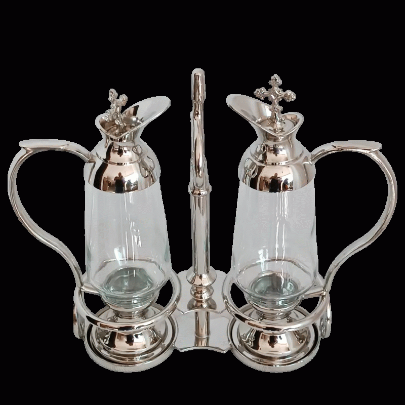Este galheteiro foi cuidadosamente elaborado para uso litúrgico, unindo funcionalidade e reverência à beleza da celebração eucarística.