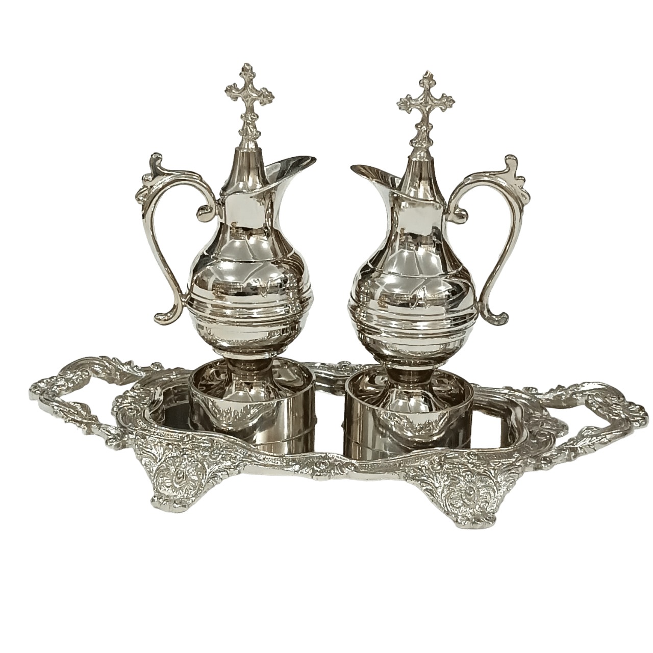 Conjunto Galheteiro composto por 2 galhetas para água e vinho e um suporte.