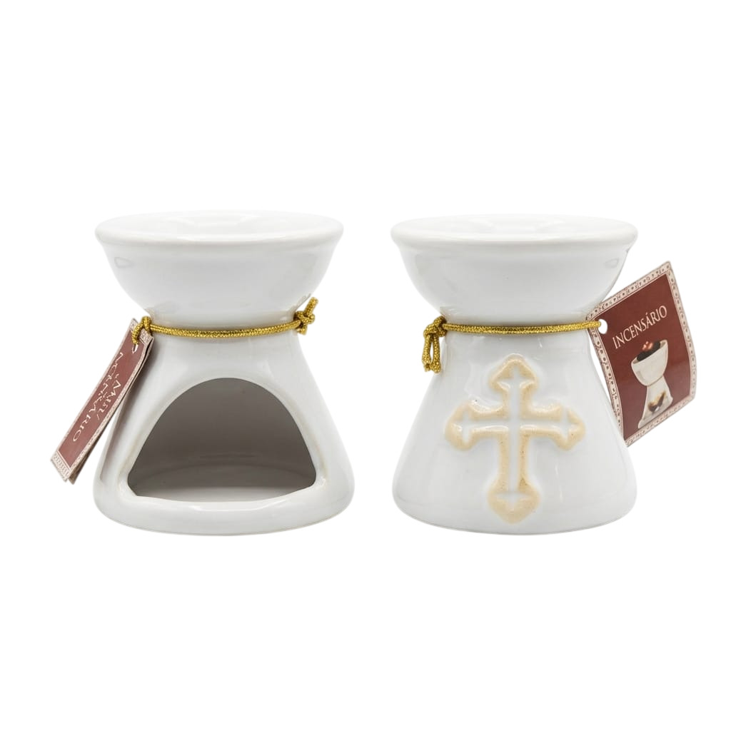 Este incensário em resina é uma peça prática e elegante, ideal para momentos de oração, meditação e uso litúrgico. Com design compacto e acabamento esmaltado, ele traz um visual sereno e simbólico, destacando a cruz frontal que reforça seu significado religioso.
