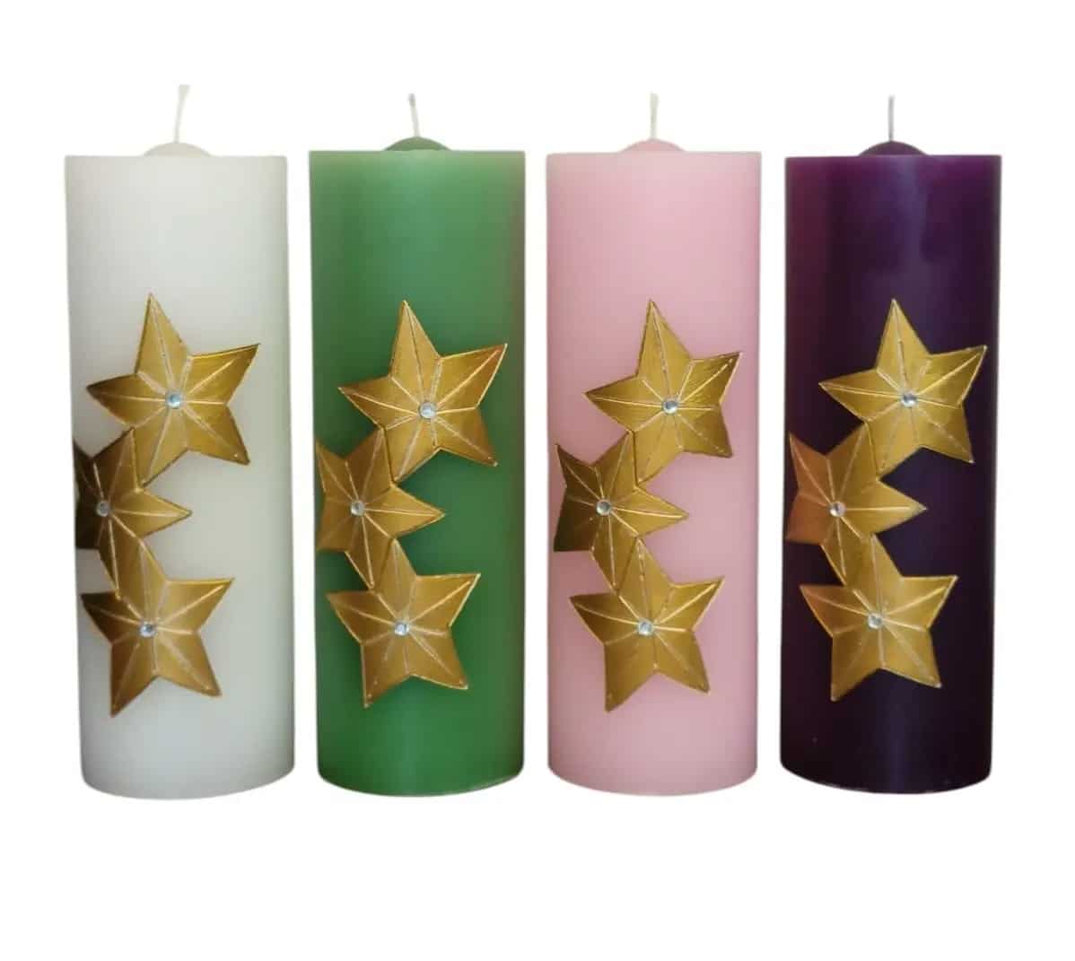 Descrição: Celebre o tempo do Advento com o Kit de Velas Estrelas, que traz beleza e significado para suas cerimônias religiosas. Fabricadas com parafina pura destilada e pavio de algodão, essas velas são adornadas com entalhes a mão, proporcionando um toque de elegância às celebrações.