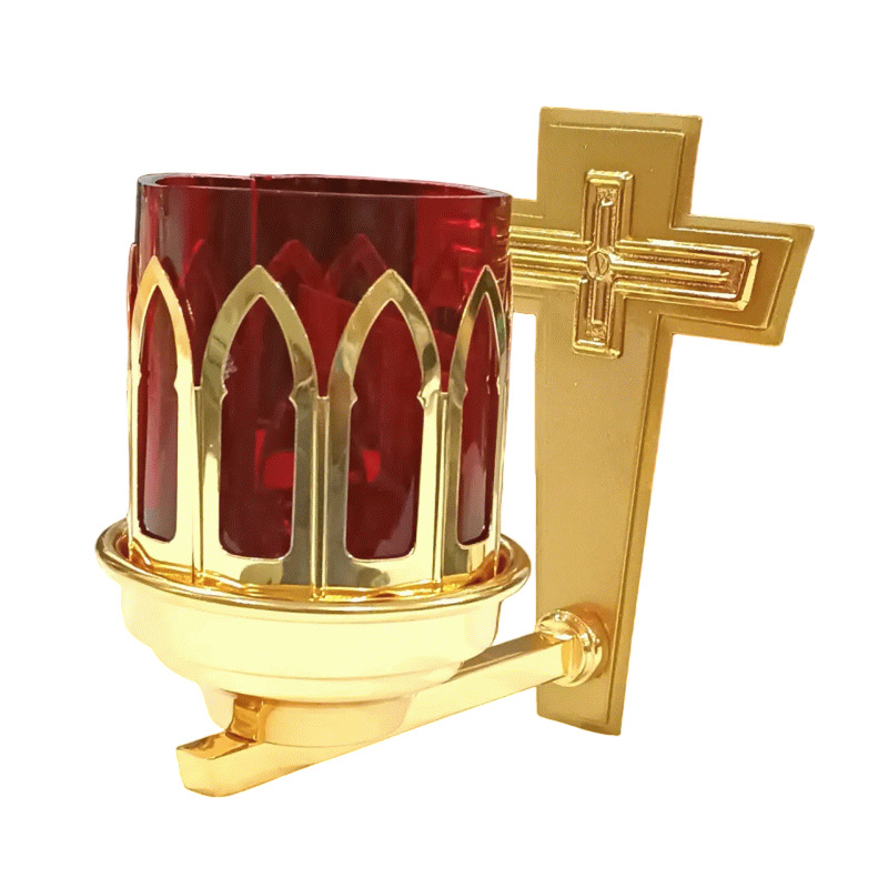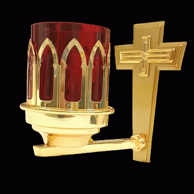 Lâmpada do Santíssimo modelo L003, fabricada em metal com banho dourado, com copo de acrílico. Acompanha fio e lâmpada E14, disponível em 110 ou 220 volts.