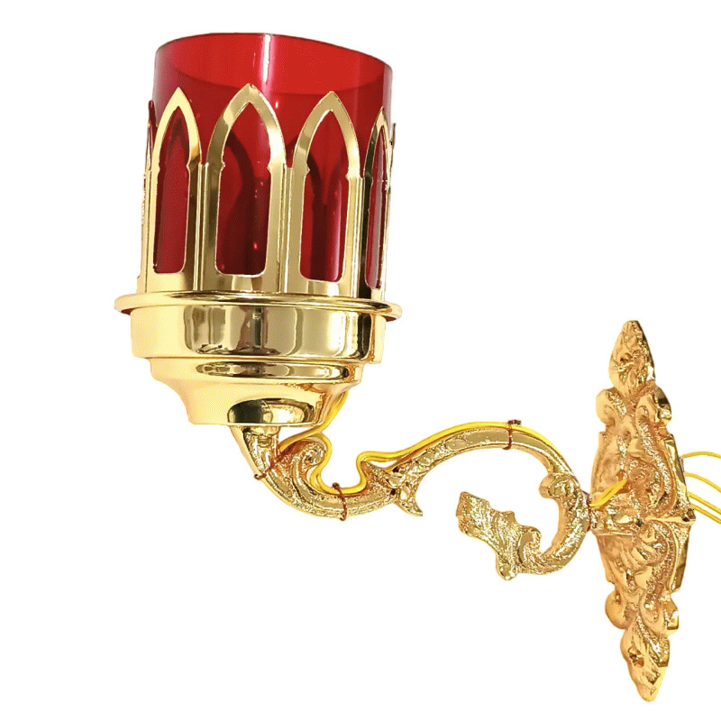 Lâmpada Santíssimo. Lâmpada do santíssimo para fixar na parede fabricada em metal com banho dourado e copo de acrílico. Acompanha fio e lâmpada. Disponível em 110 ou 220 volts.