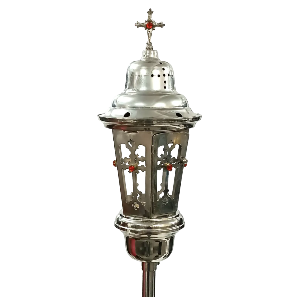 Parece que você está descrevendo um tocheiro processional, ideal para ser utilizado em procissões. Vou organizar e detalhar a descrição para facilitar a compreensão: