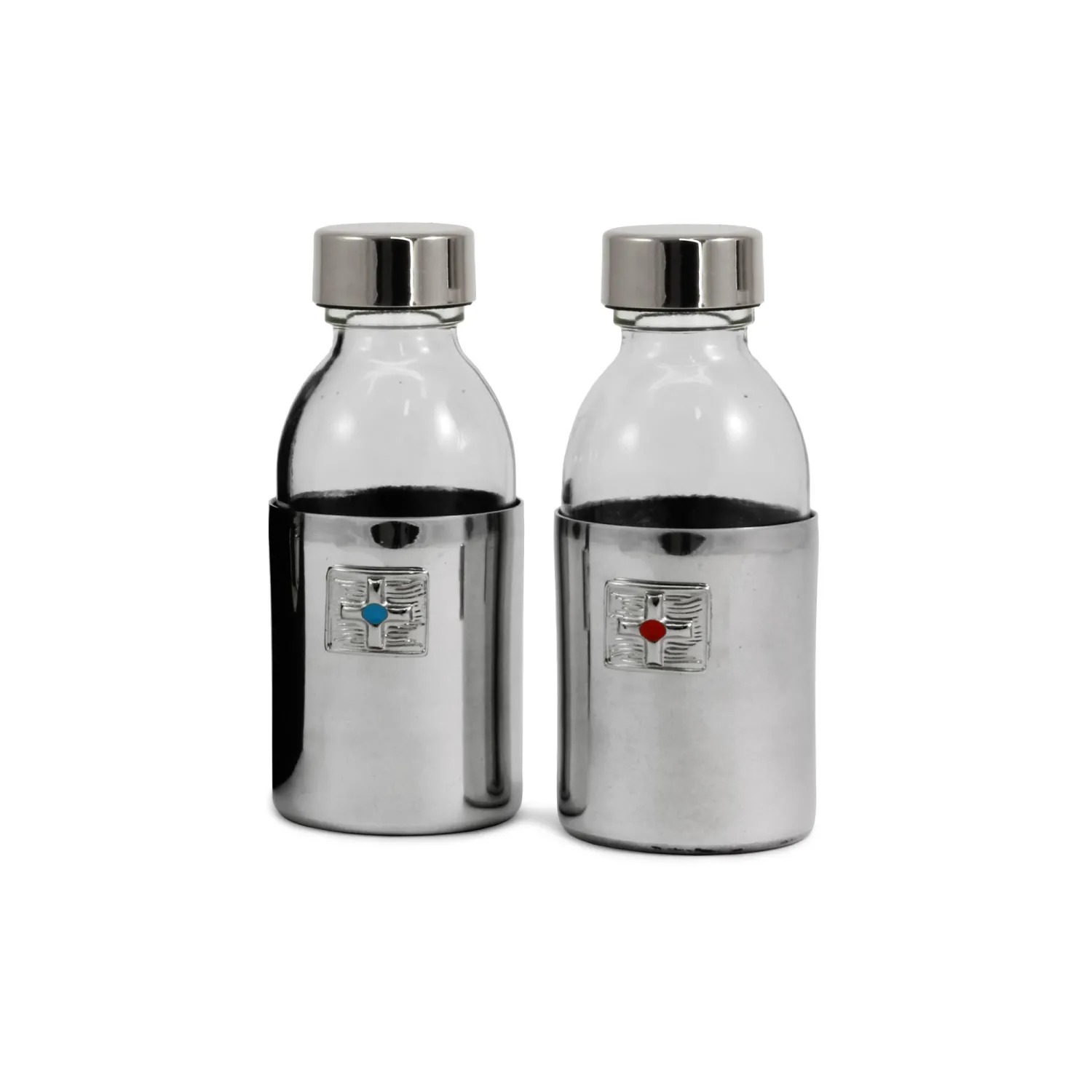 – Garrafas de água e vinho de 250 ml, 125 cm, com armadura protetora e placa distinta esmaltada à mão para distinguir água de vinho.