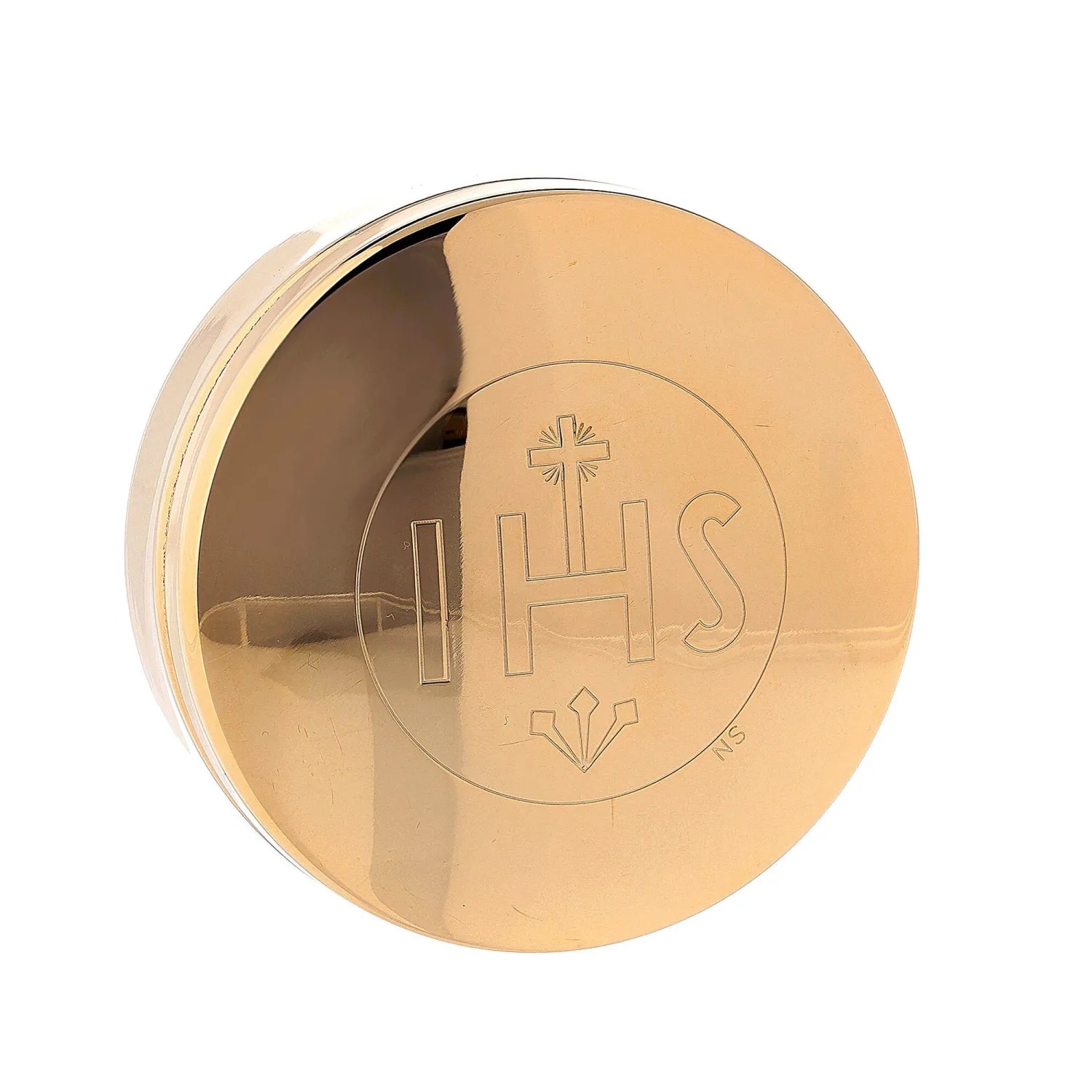 – Porta-hóstias em latão dourado com placa decorativa. A caixa tem 8 cm de diâmetro e comporta aproximadamente 40 hóstias.