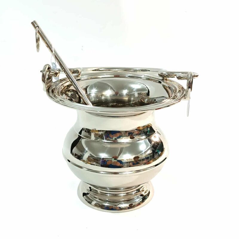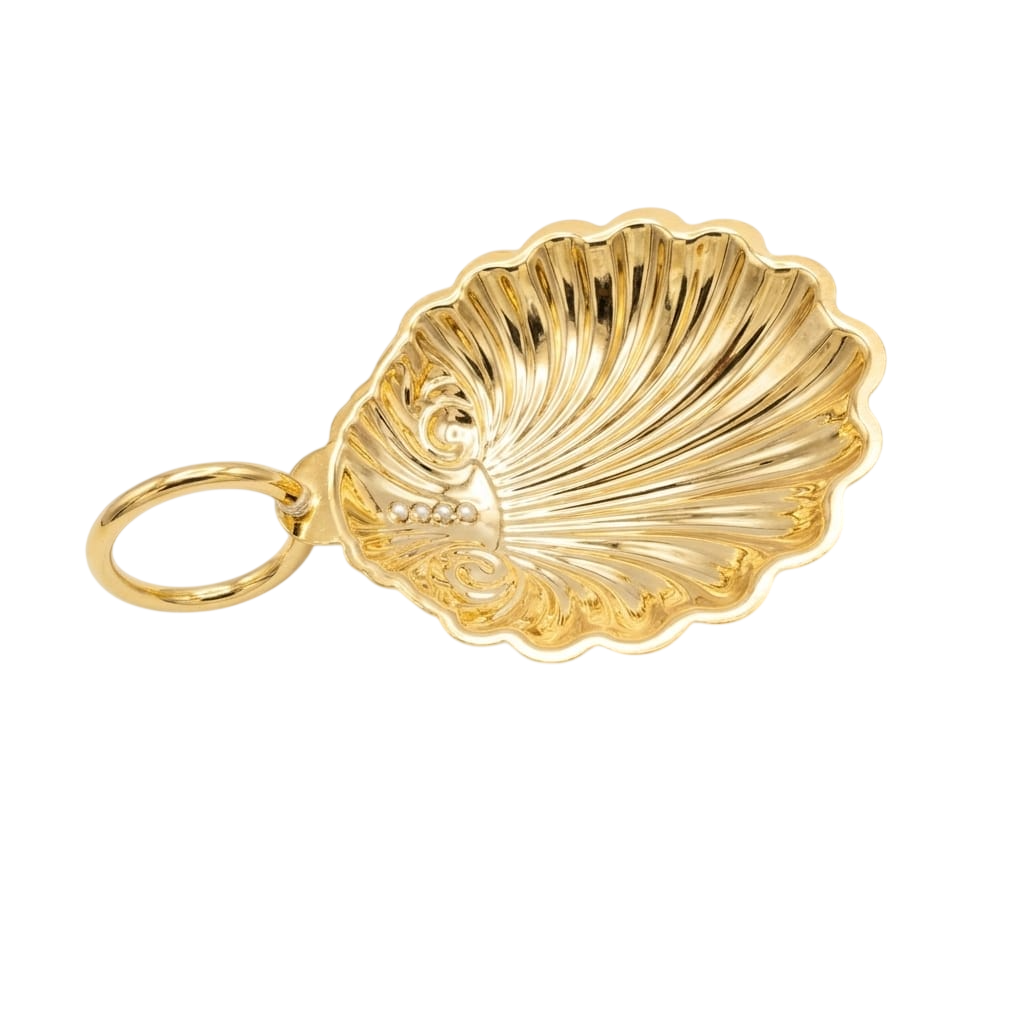 Com acabamento dourado brilhante, apresenta detalhes em relevo que valorizam seu design clássico em formato de concha, trazendo ainda mais elegância e destaque ao momento litúrgico. Seu tamanho compacto de 6,5 cm proporciona praticidade no manuseio, enquanto o aro lateral garante firmeza e segurança durante o uso.