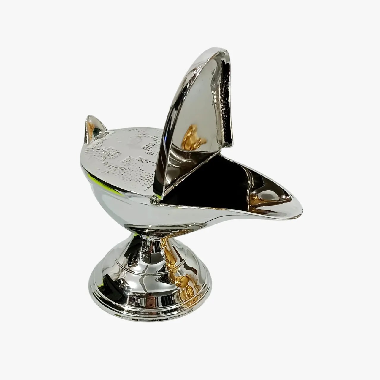 Esta naveta litúrgica, elaborada com metal de alta qualidade e banho de níquel, é ideal para a queima de incenso durante cerimônias religiosas católicas. Seu acabamento brilhante e durável reflete a tradição e o requinte do design italiano. Na tampa o desenho de uma cruz.