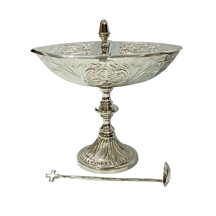 Naveta Cinzelada 6025. Produzido em metal, com banho niquelado. Trabalhada a mão.