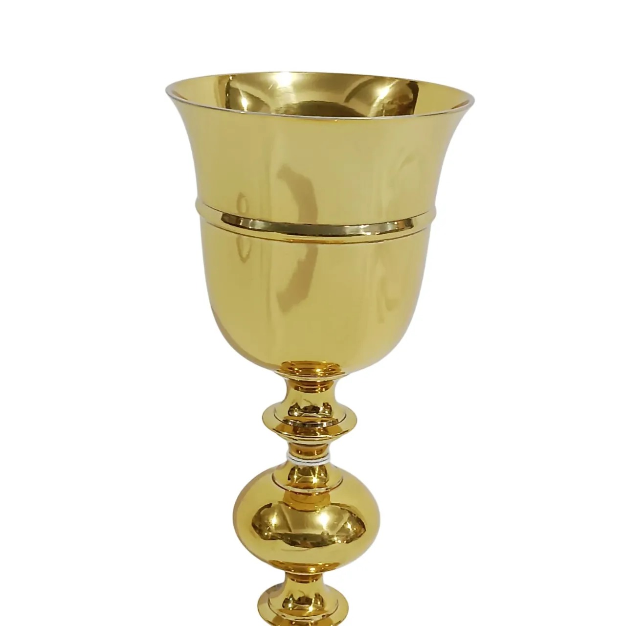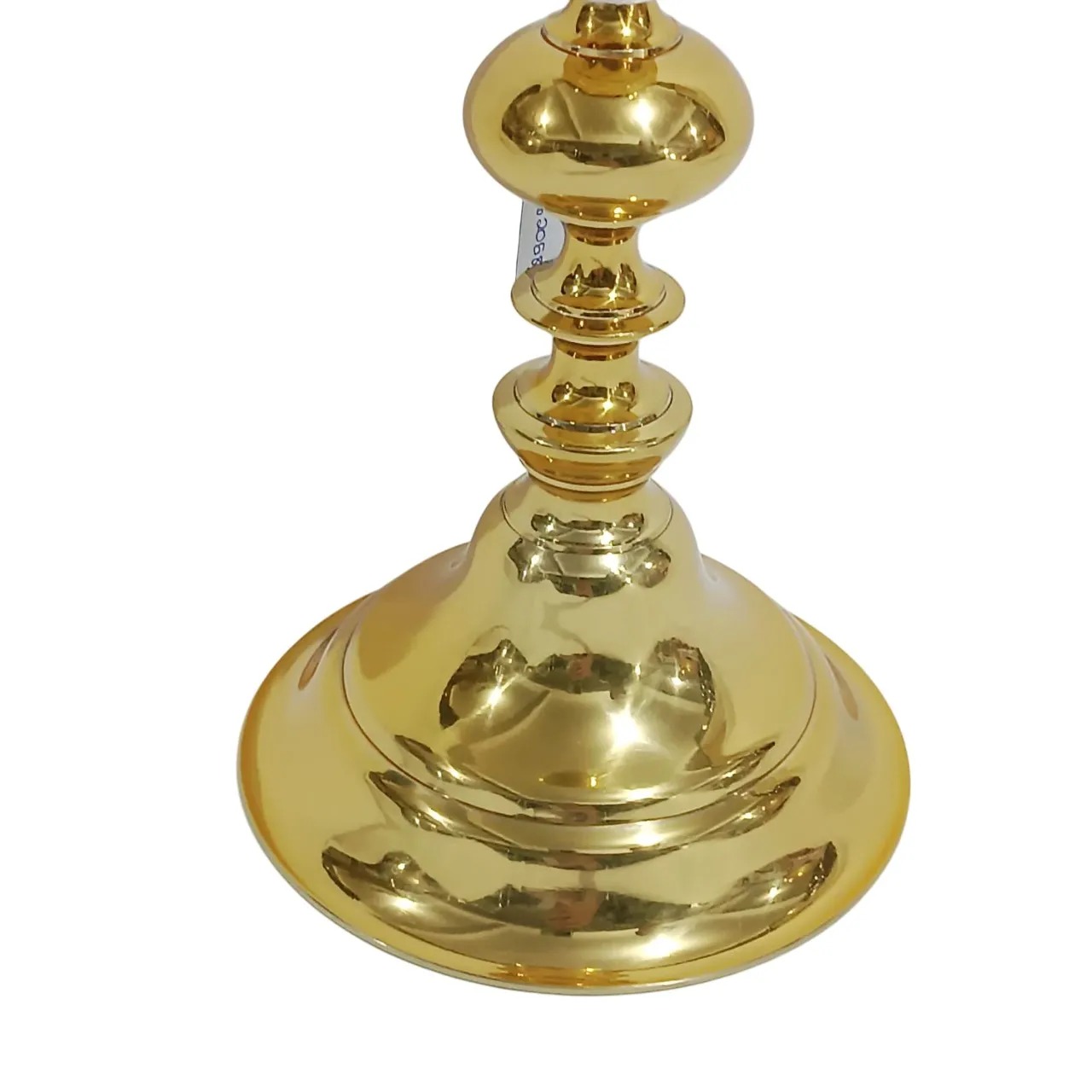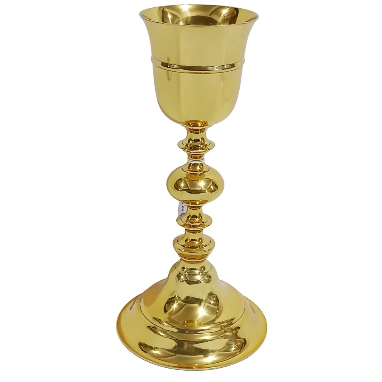 O Cálice F529a Dourado é produzido em estanho polido com banho prateado. Trata-se de um cálice imponente, podendo ser usado em capelas ou matrizes. Não acompanhado da patena.