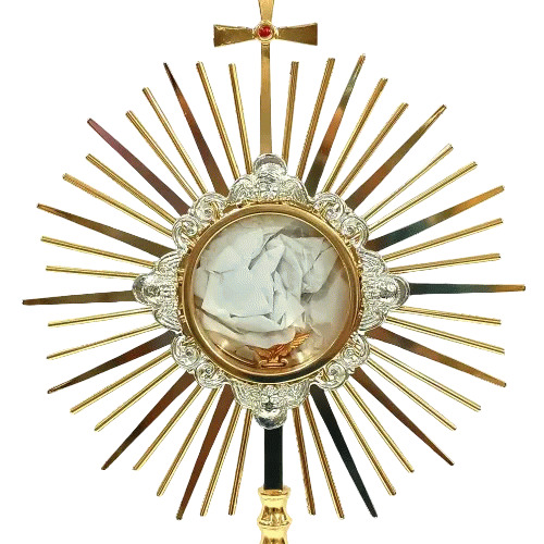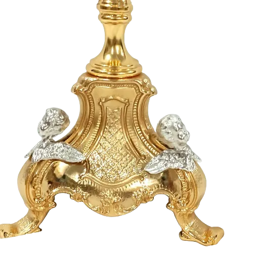 Ostensório italiano em estilo barroco. Produzido em latão fundido, pelo sistema de cera perdica. Além do banho de ouro 24k e anjos prata, possui uma camada de verniz protetora.