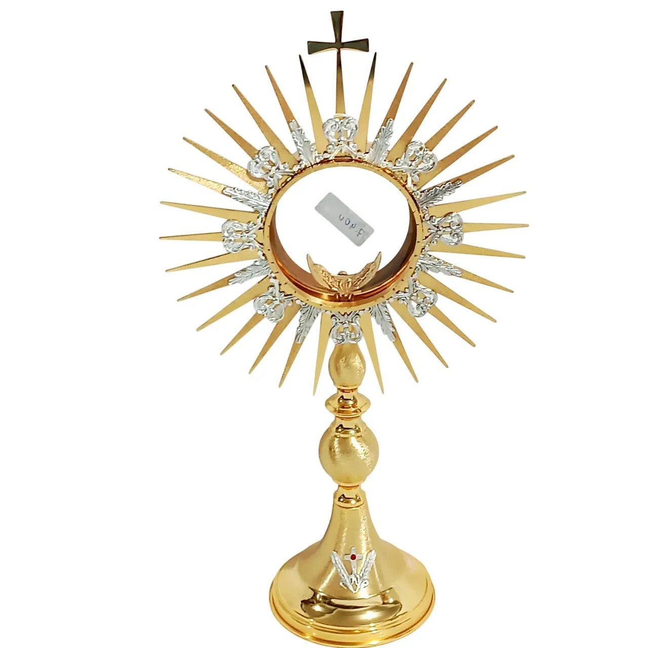 Com 67 cm de altura e 37 cm de diâmetro na raiada, possui teca própria para hóstia de até 16 cm de diâmetro, protegida por acrílicoo. A base e a haste são cuidadosamente trabalhadas, garantindo firmeza, elegância e durabilidade para o uso litúrgico.