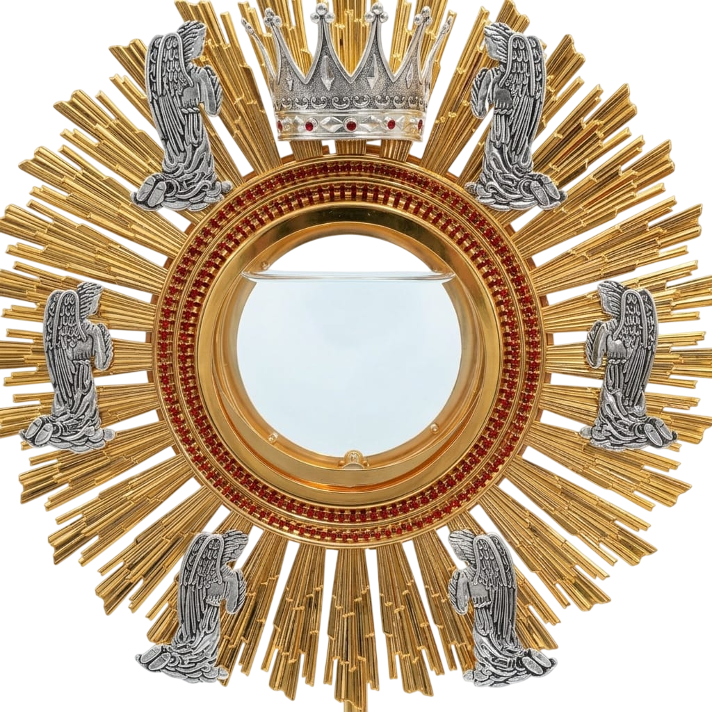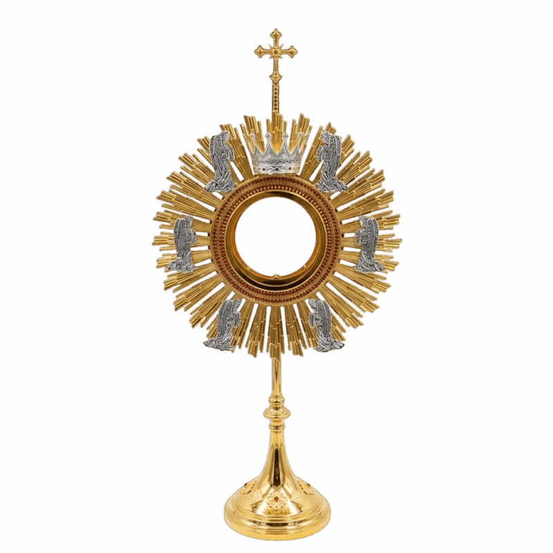 Ostensório. Ostensório feito em latão, com repuxo. Acabamento liso polido, com banho especial