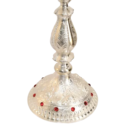 Ostensório estilo ambrosiano, feito em latão e banhado a níquel e ouro 24k com apliques em níquel. Anjos no topo e uma linda cruz