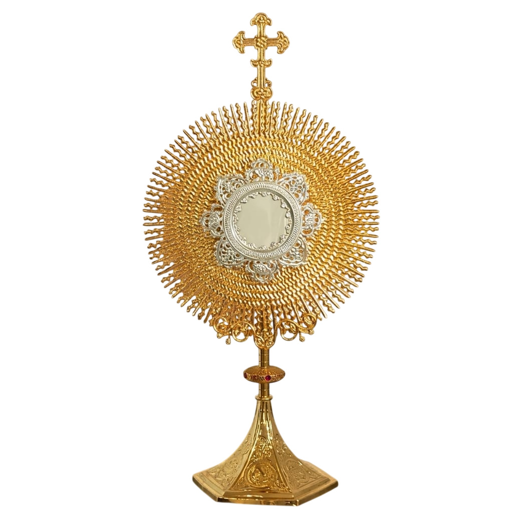 Apresenta raios dourados que emanam do centro, simbolizando a glória de Cristo, e uma delicada moldura com detalhes vazados em prata, realçando ainda mais a beleza do Santíssimo Sacramento. A peça é finalizada com uma cruz artística no topo.