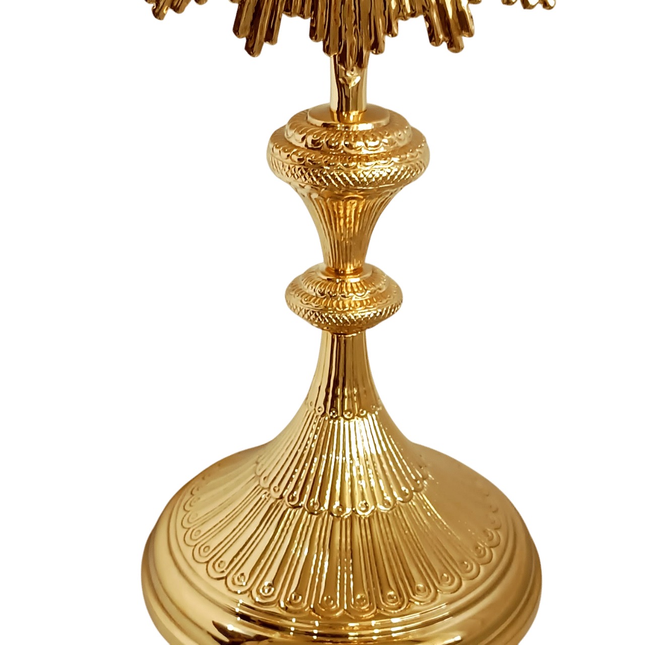 Uma peça litúrgica de grande beleza e simbolismo, o Ostensorio it15 é ideal para exposições eucarísticas e procissões. Produzido artesanalmente em latão de alta qualidade, com acabamento em banho de ouro 24k, que confere brilho intenso e proteção.
