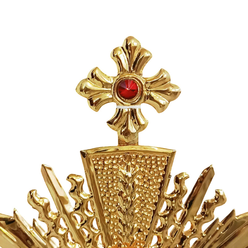 Este belíssimo ostensório combina elegância e reverência em sua estrutura, ideal para a adoração eucarística. Produzido na Itália, é confeccionado em metal com banho dourado e detalhes em prata na moldura do viril. Seu design traz uma composição de raios dourados em diversos formatos, enriquecidos com texturas em alto-relevo. No topo, uma cruz estilizada dourada, com pedra central vermelha, complementa a peça.