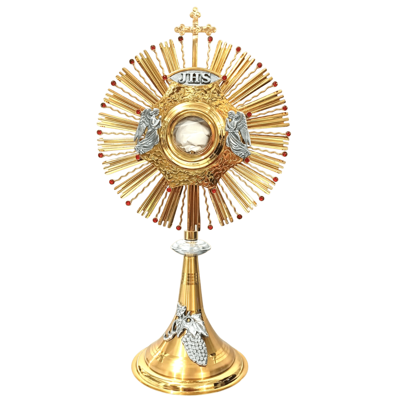 Ostensório. Ostensório estilo barroco, feito em estanho fundido e banhado a ouro 24k com apliques em níquel.