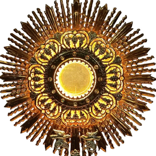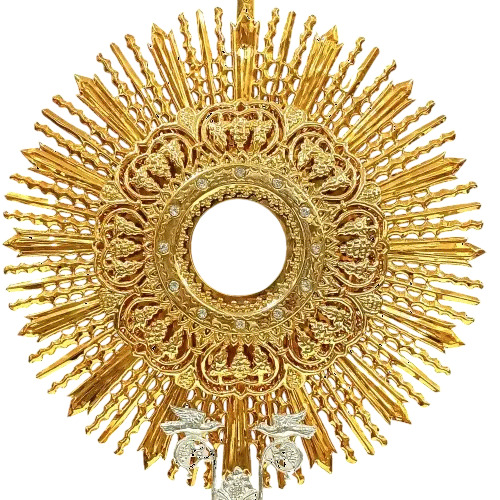 Ostensório estilo barroco, feito em latão com repuxo e cinzelado manualmente. Banhado a ouro 24k com apliques em níquel.