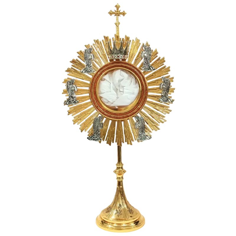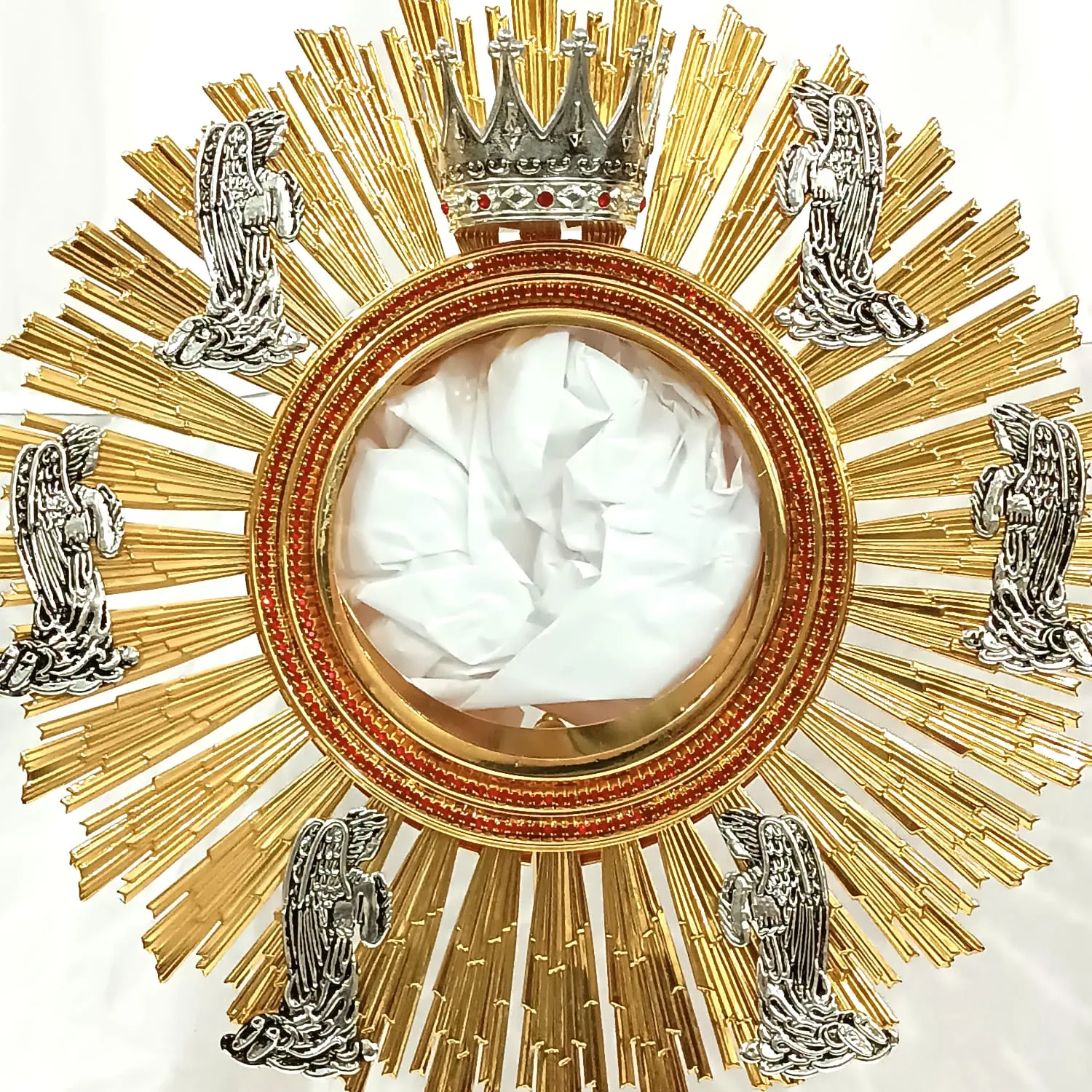 Ostensório estilo barroco, feito em latão com repuxo e cinzelado manualmente. Banhado a ouro 24k com apliques em níquel.