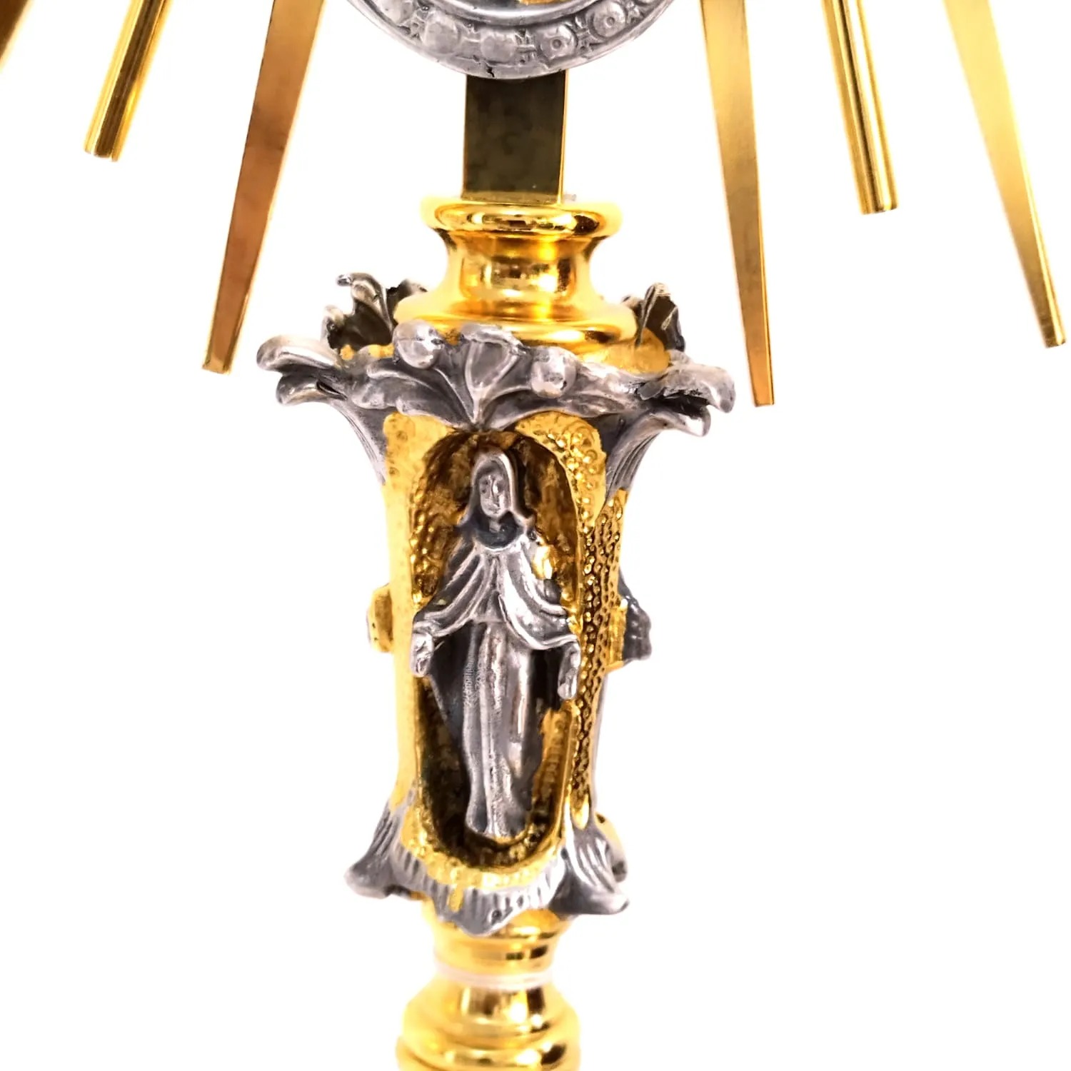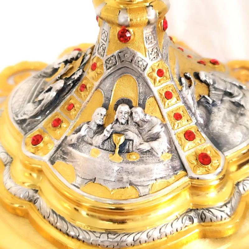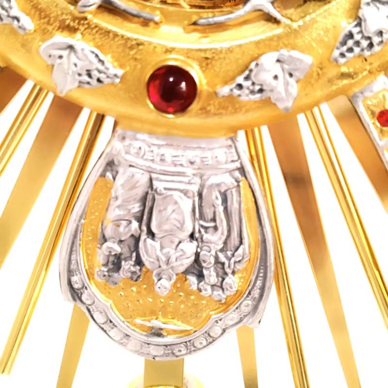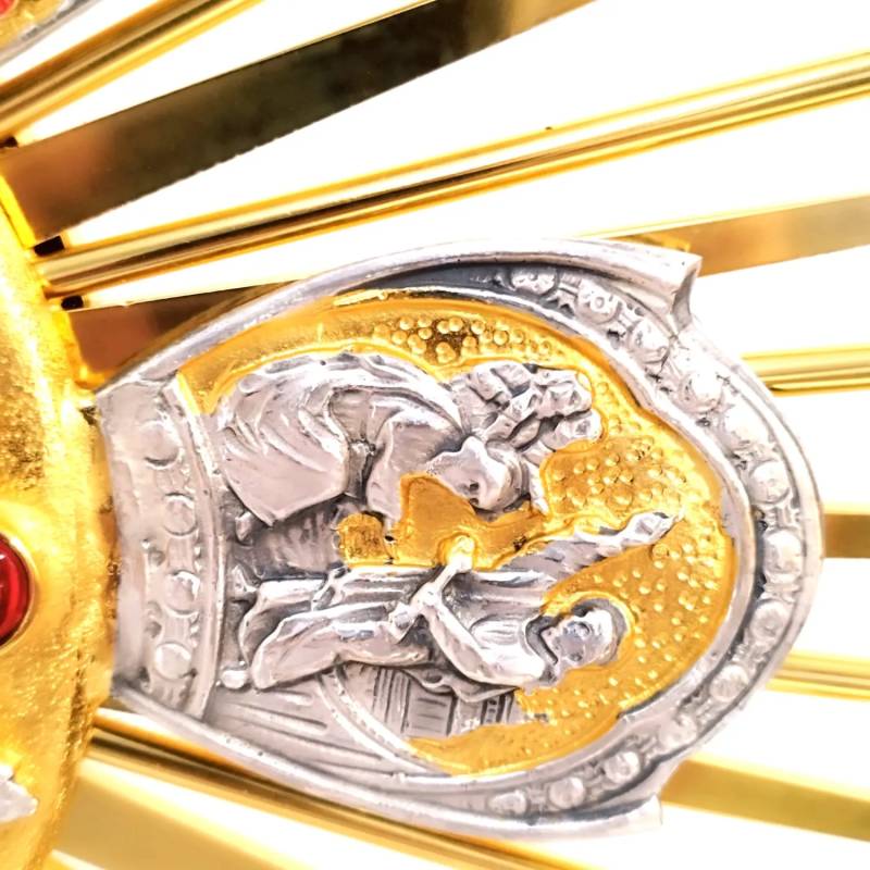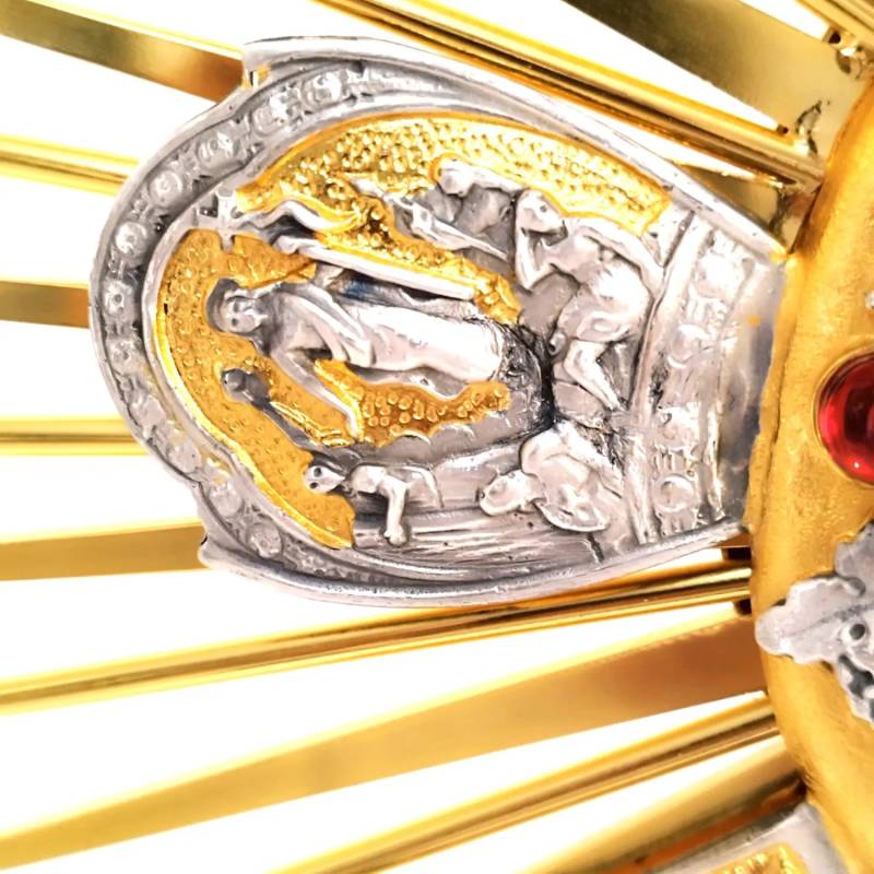 Ostensório lindo, metal em cera fundida, com banho de ouro 24k e níquel. Apresenta tanto na base quanto na raiada diversas cenas do novo testamento. Um peça maravilhosa e digna