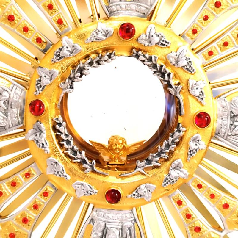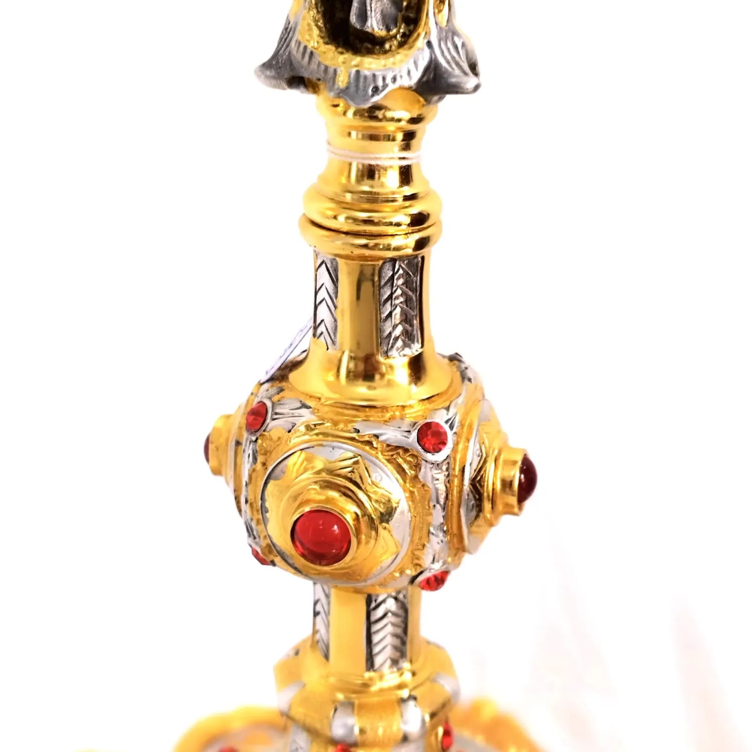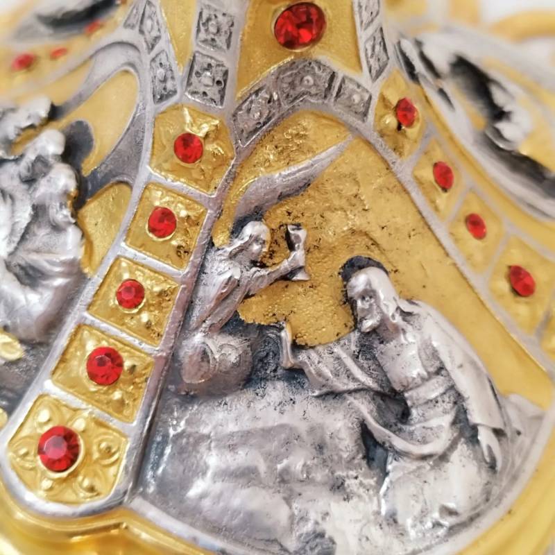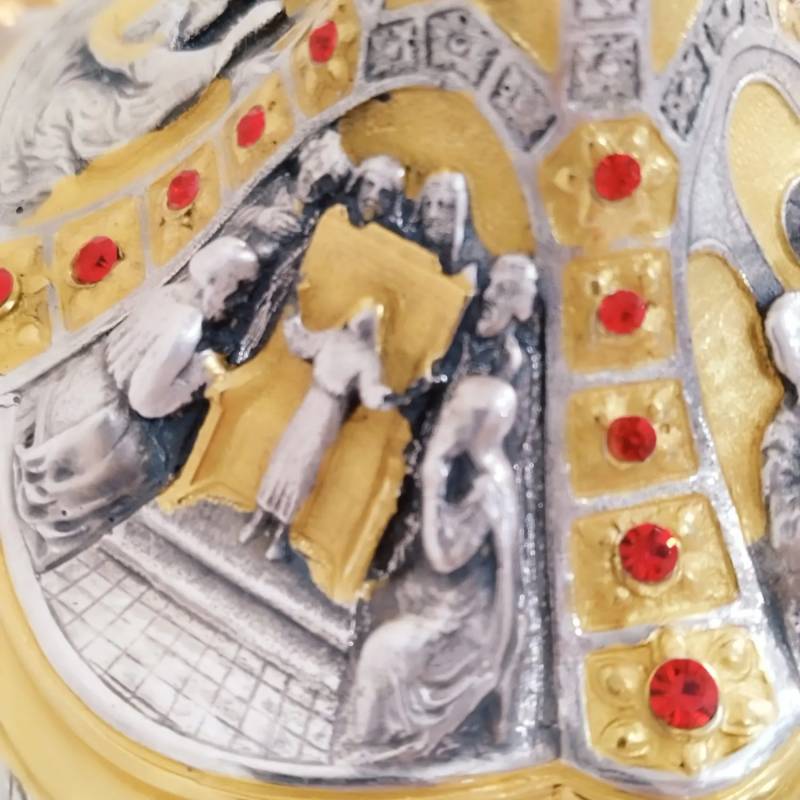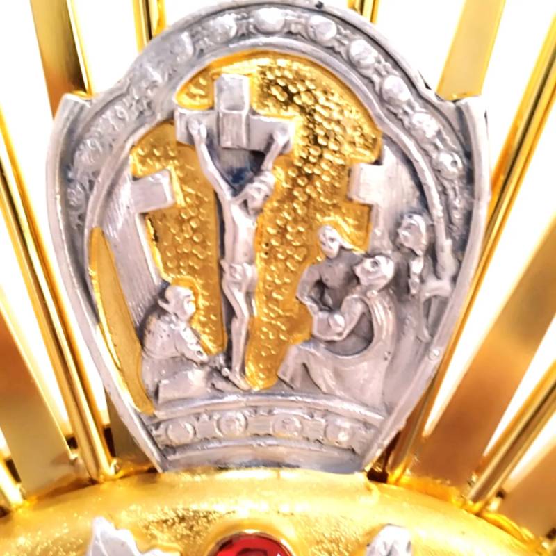 Ostensório lindo, metal em cera fundida, com banho de ouro 24k e níquel. Apresenta tanto na base quanto na raiada diversas cenas do novo testamento. Um peça maravilhosa e digna