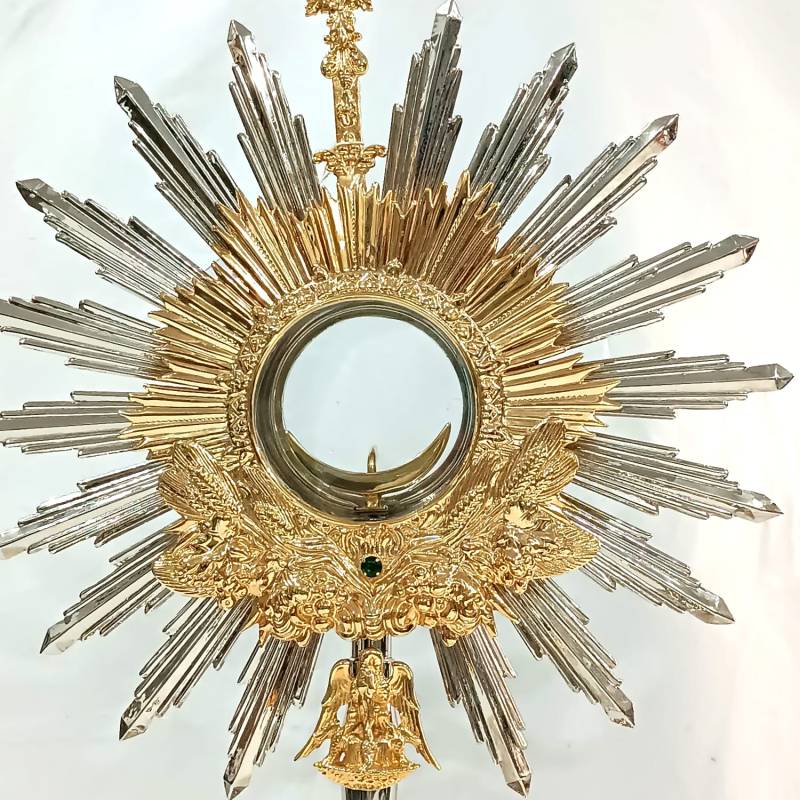 Ostensório estilo barroco, feito em latão com repuxo e cinzelado manualmente. Banhado a níquel com apliques em ouro 24k.