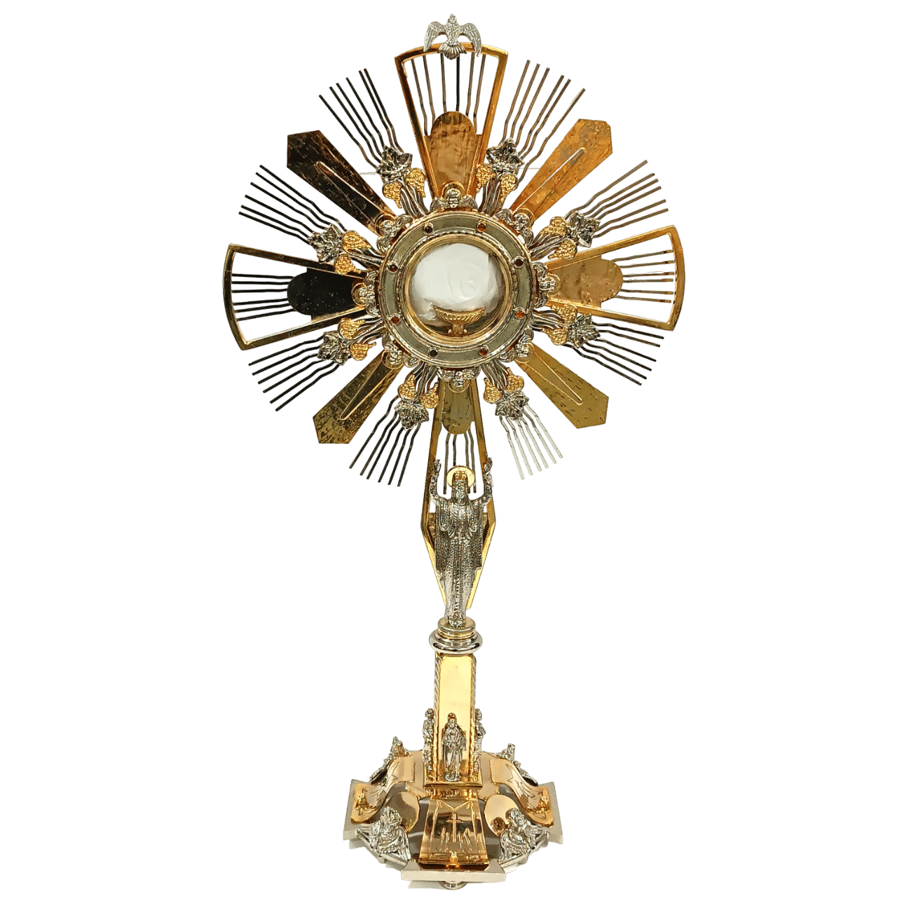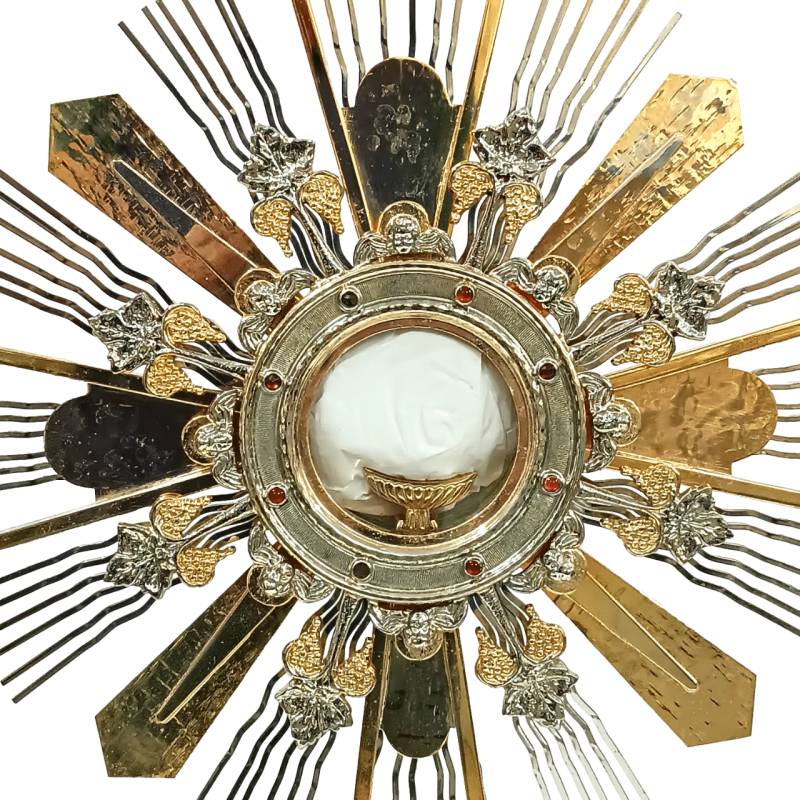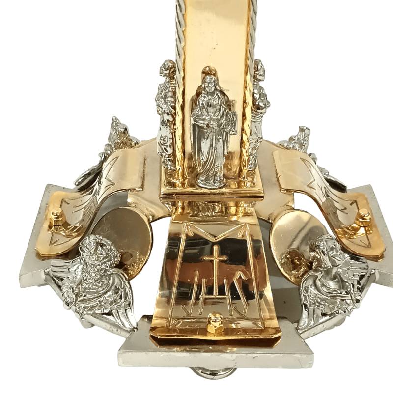 Ostensório estilo barroco, feito em latão com repuxo e cinzelado manualmente. Banhado a ouro 24k com apliques em níquel.