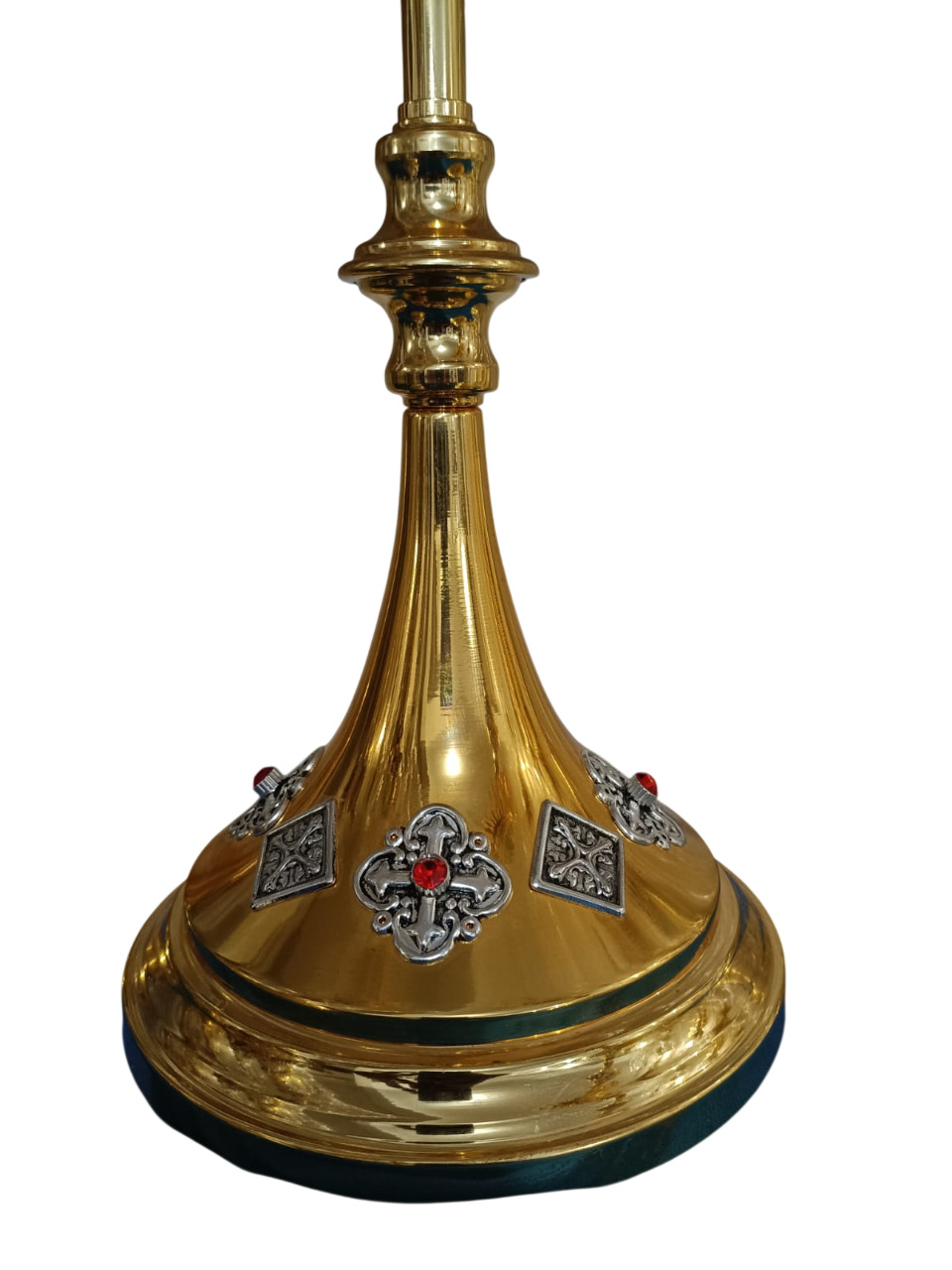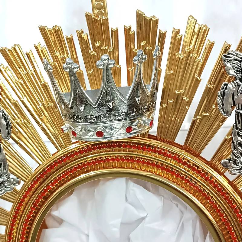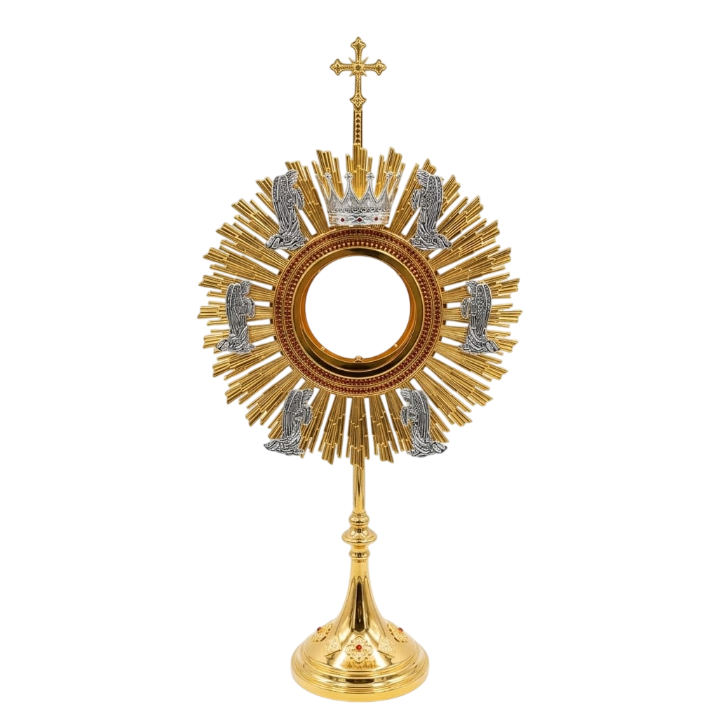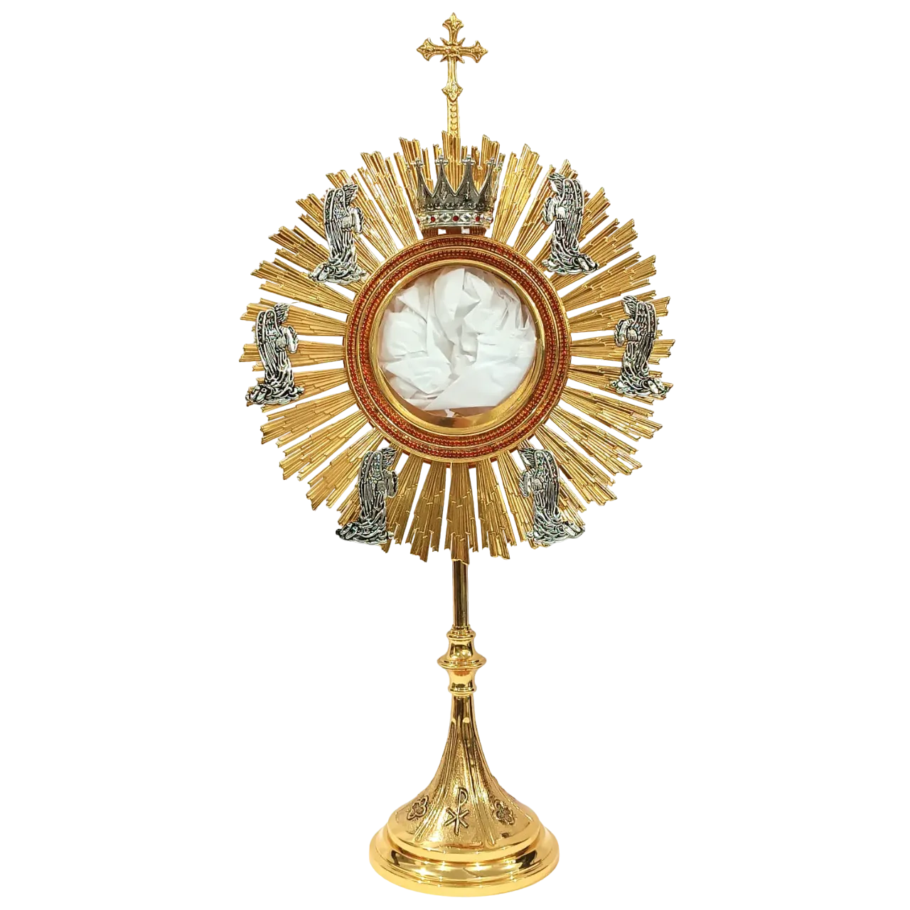 Ostensório lindo, estilo clássico, metal repuxado e polido. Com raiada fundida. Banho de ouro. Pedraria ao redor da caixa de hóstia e anjos na raiada
