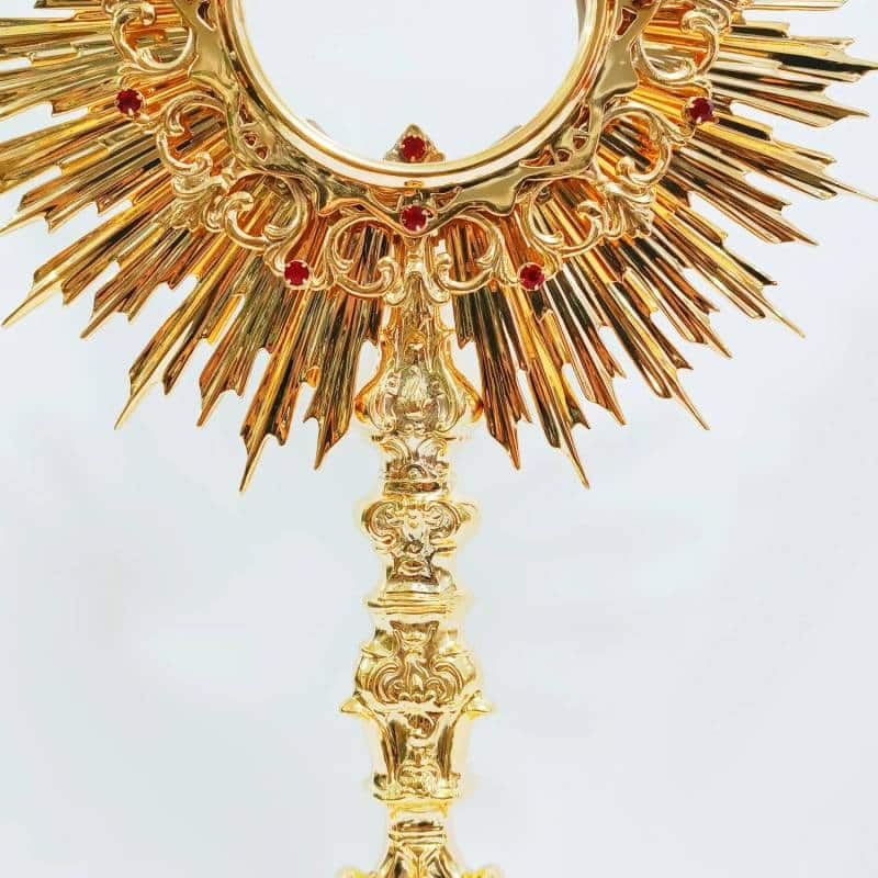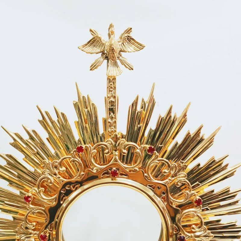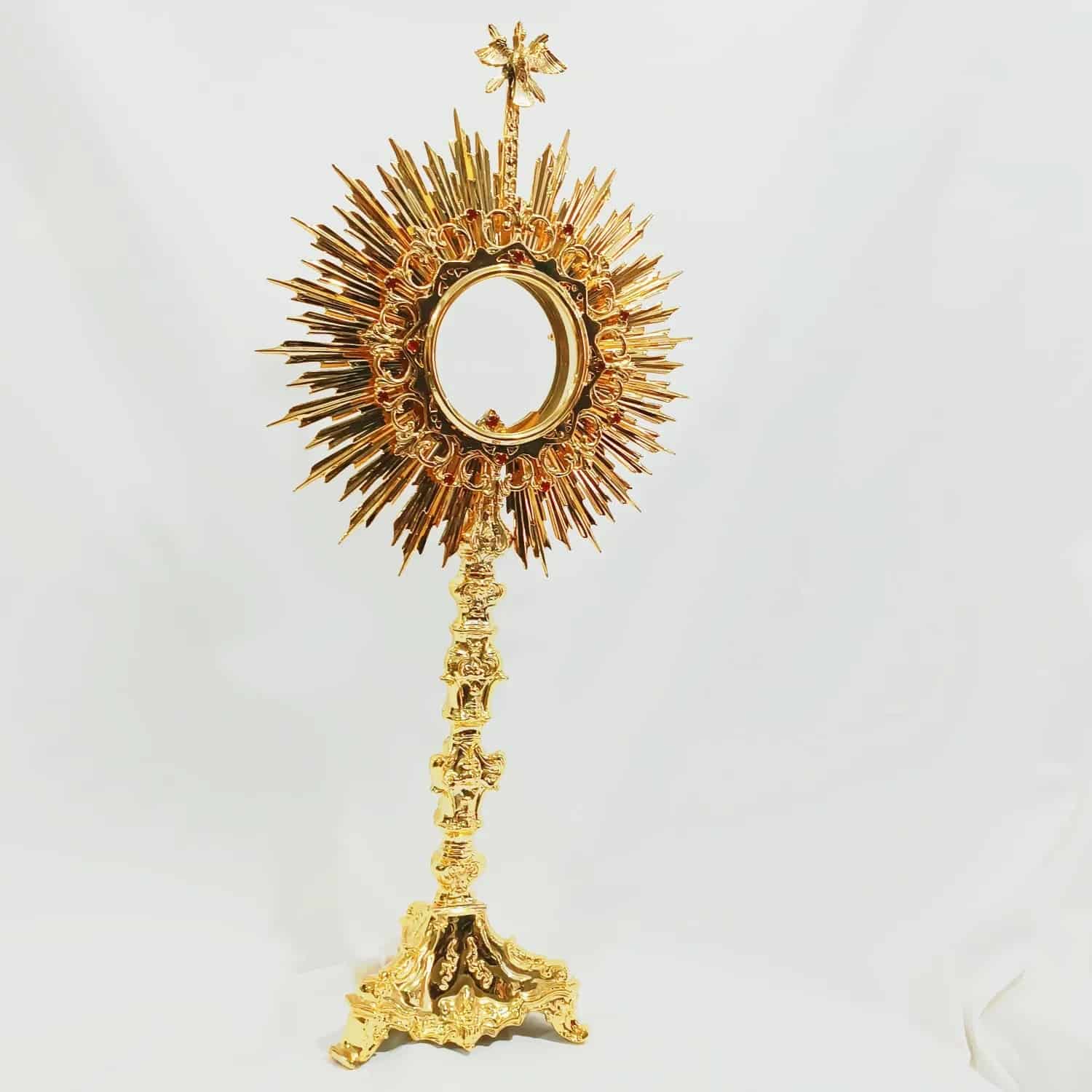 Ostensório confeccionado em metal fundido com fino acabamento e banho de ouro, apresentando design clássico com raios duplos que irradiam em torno da custódia central. No topo, destaca-se o símbolo do Espírito Santo em forma de pomba, complementando a composição litúrgica.