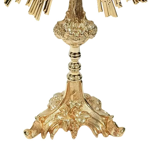 Ostensório estilo barroco, feito em estanho fundido e banhado a ouro 24k com apliques em níquel. Possui pedras vermelhas